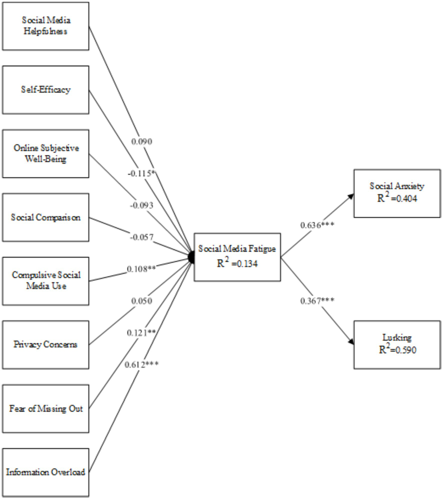 Table 5 shows the results of the hypothesis testing. Social media self-efficacy had a negative significant effect on social media fatigue (β = −0.115, p < 0.05); compulsive social media use, FoMO, and information overload had a positive significant effect on social media fatigue (β = 0.108, p < 0.01; β = 0.121, p < 0.01; β = 0.612, p < 0.001). Therefore, H2, H5, H7, and H8 were supported. However, social media helpfulness, online subjective well-being, social comparison, and privacy concerns had no significant effect on social media fatigue (β = 0.090, p > 0.05; β = −0.093, p > 0.05; β = −0.057, p > 0.05; β = 0.050, p > 0.05). Therefore, H1, H3, H4, and H6 were not supported. Finally, social media fatigue had a positive and significant effect on social anxiety (β = 0.367, p < 0.001) and lurking (β = 0.636, p < 0.001), indicating that H9 and H10 were supported (Table 6).