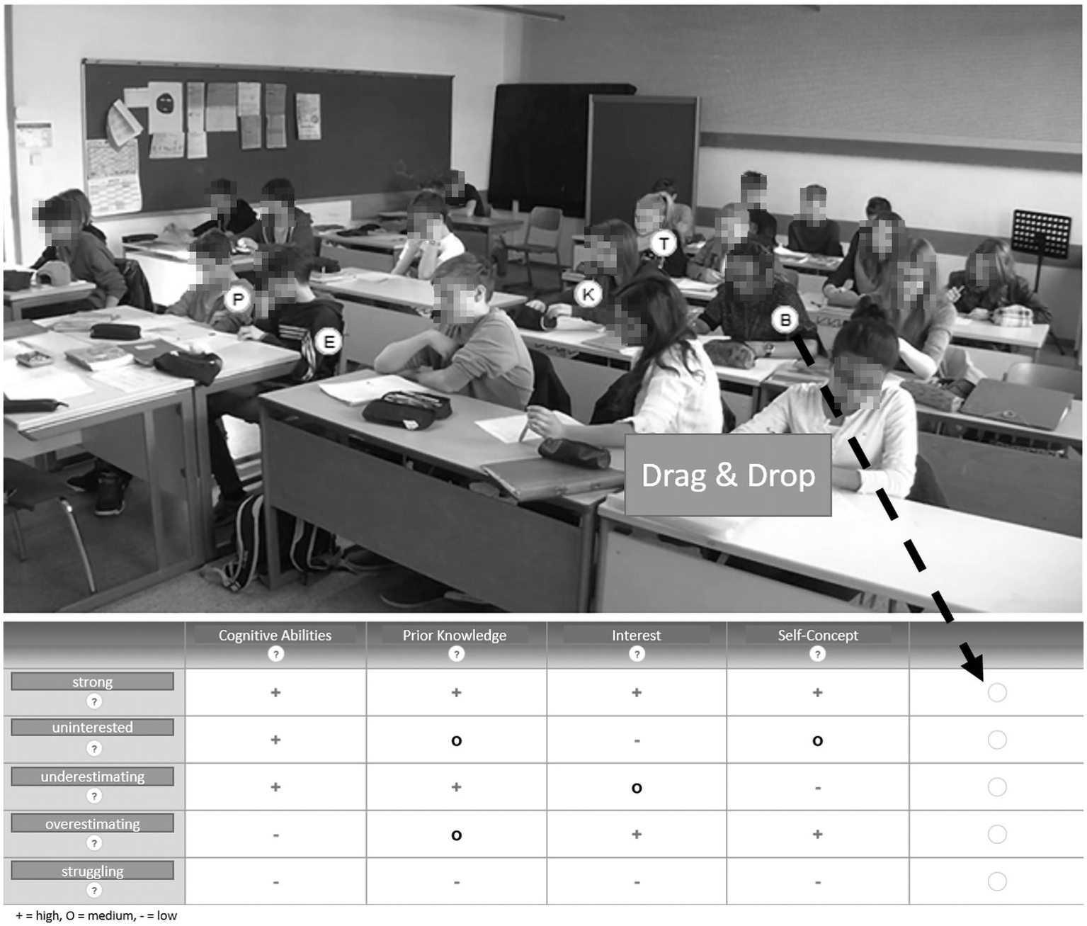 The correct judgment of a student was based on its match to the corresponding student profile. To perform the judgment after observing the video clip with the labeled students (the letters were unconnected to the profiles), participants were prompted to drag and drop the letters into a table, corresponding to their judgment of the student profile (see Figure 1). In case they were uncertain, they were also able to assign an additional, alternative profile. For each student profile, participants were assigned an accuracy score: A score of 0 represented an incorrect diagnosis. If a teacher first assigned an incorrect profile but stated the correct profile in their alternative choice, they received 0.5 points. Teachers received a score of 1 for a correct diagnosis. Overall, participants’ cumulative scores could range from a score of 0 (no correct judgments) to a score of 5 (all judgments correct).