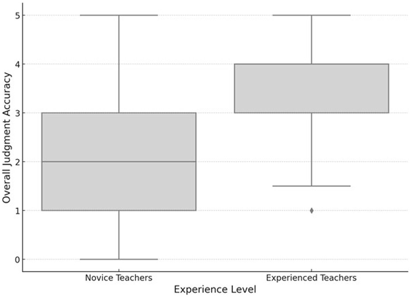 The primary goal of our first research question is to identify potential systematic differences between novice and experienced teachers with regard to the accuracy of their judgments. Specifically, we aim to (a) assess their overall accuracy in assessing different student profiles, and (b) examine the accuracy of their judgments for each individual student profile. Descriptively, we found that experienced teachers generally had a higher overall judgment score (M = 3.47; SD = 1.26), compared to novice teachers (M = 2.42; SD = 1.62). However, the standard deviations indicate substantial variability within both groups. Figure 2 presents a boxplot visualization of the overall judgment accuracy, highlighting a higher median score for experienced teachers. Additionally, the boxplot suggests a slightly larger range of scores for novice teachers, implying greater variability in their overall judgment scores.