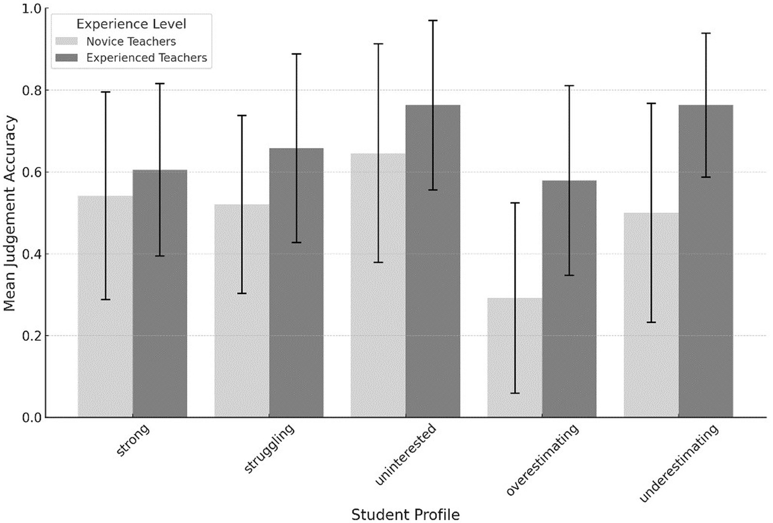 Mean judgment accuracy is separated for each student profile across experience levels.