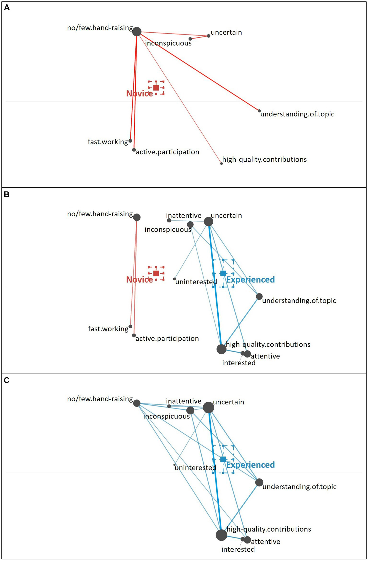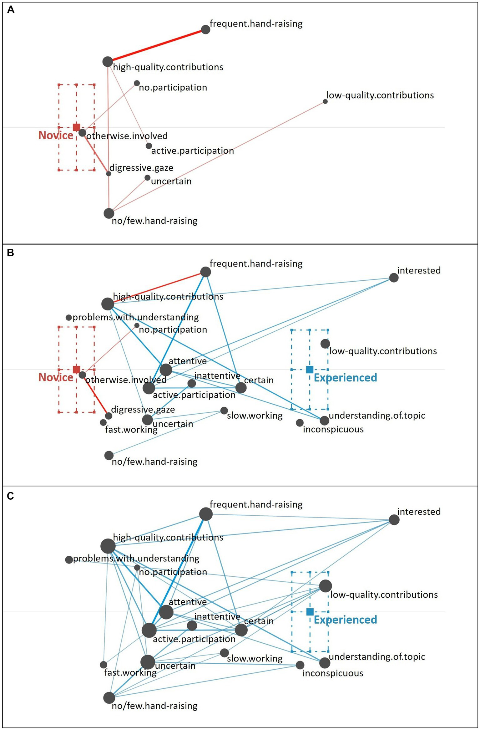 To explore (RQ2a) novice and experienced teachers’ reasoning across different student profiles, we initially compared the network graphs as specified above, accumulating co-occurrences of cues coded in the written responses per participant and then per group of novice and experienced teachers. To explore (RQ2b) novice and experienced teachers’ reasoning about each student profile in more detail, we filtered the written responses that addressed the individual student profiles and then performed the same analysis for each student profile.