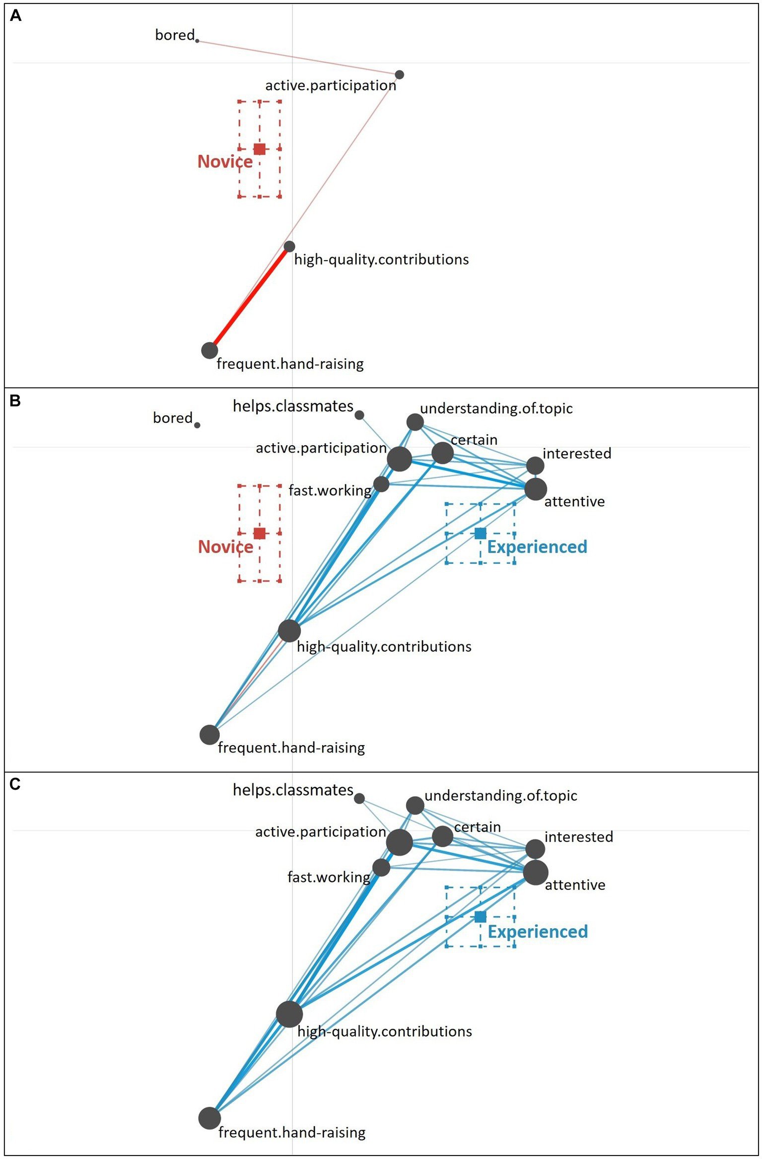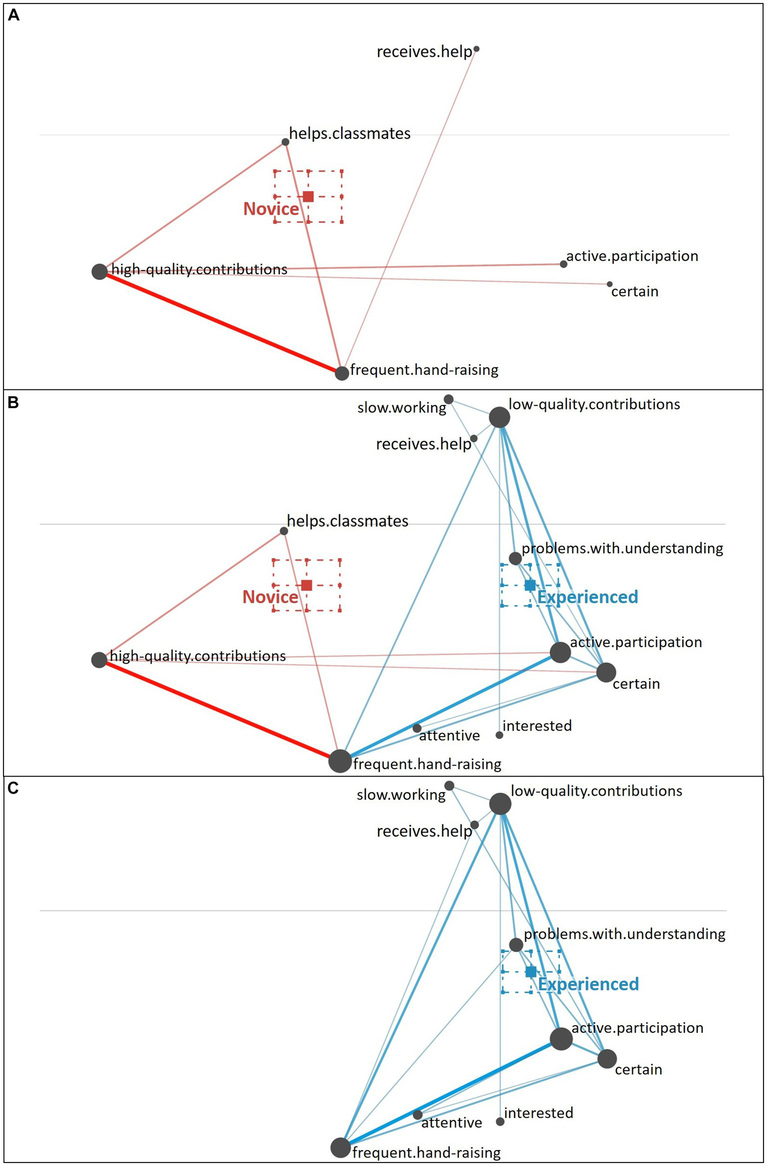 The colored edges in the network graphs refer to the relations (i.e., co-occurrences) of cues, with thickness indicating the strength of relations (i.e., the relative frequency of co-occurrences). Weak relations were not shown in our network graphs to facilitate the interpretability of the networks (the minimum edge weight was set to 0.06). For group comparisons, ENA creates a set of three related network graphs respectively: In our analysis, one network graph depicts the novice teachers’ reasoning, one network graph depicts the experienced teachers’ reasoning, and a comparison graph depicts only the differences between the novice and experienced teachers’ reasoning.