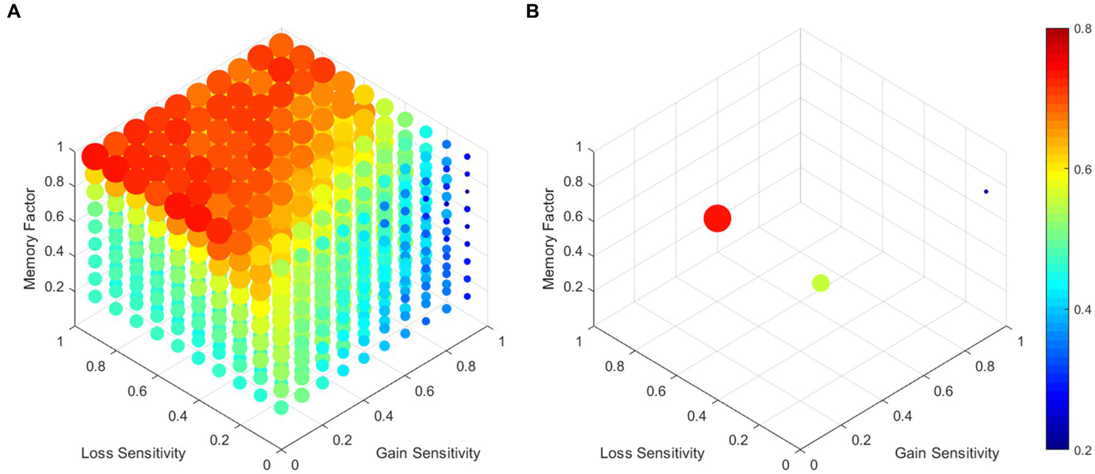To assess the relative preference for the advantageous choices ((A + B)/(A + B + C + D)), we systematically varied the gain sensitivity, the loss sensitivity, and the memory factor in increments of 0.1. A total of 900 simulations were conducted, with 50 simulations for each parameter combination. Figure 2A shows the mean relative preference for the advantageous choices across the 50 simulations for each parameter combination. Figure 2B displays the combination of parameters that resulted in a higher preference for advantageous (M = 0.9, Gs = 0.1, Ls = 0.5) and disadvantageous alternatives (M = 0.7, Gs = 1, Ls = 0.1), as well as the mean preference of all simulations (M = 0.6, Gs = 0.3, Ls = 0.2). The agents tend to choose advantageous alternatives as the memory factor and the loss sensitivity increase. The Supplementary material includes the results of each parameter combination and a version of the MATLAB 2020 code used to perform the simulations for a more detailed review.