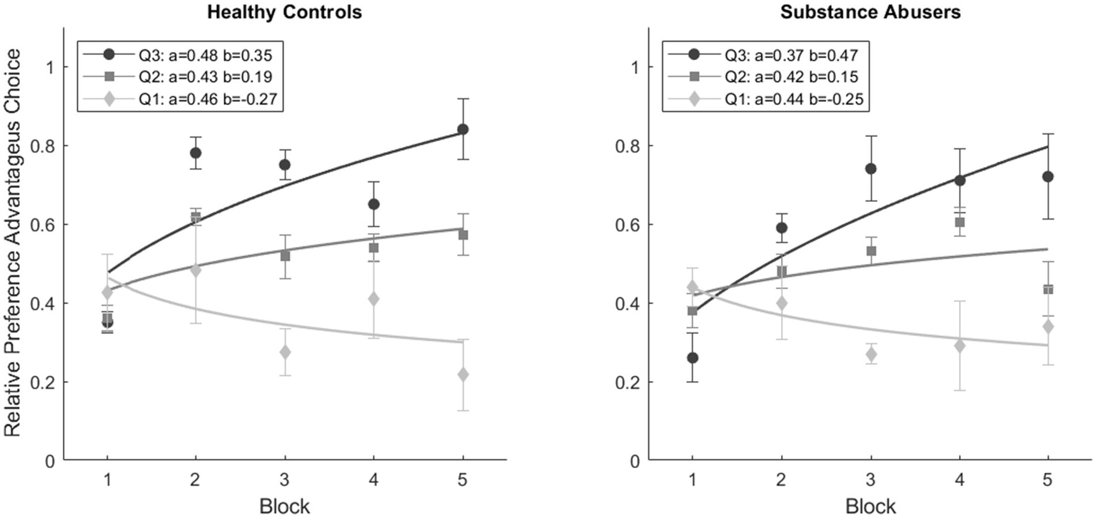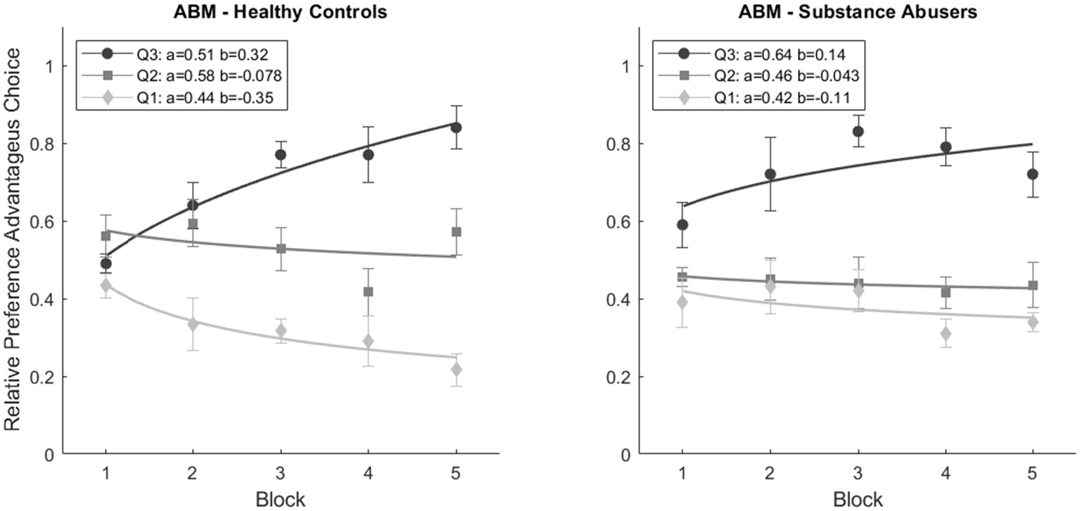 A repeated measures ANOVA revealed significant statistical differences between blocks [F(4, 38) = 9.244, p < 0.001, ω2 = 0.132] and a Block*Subgroup interaction [F(8, 38) = 7.790, p < 0.001, ω2 = 0.132]. No significant differences were observed in Block*Group interaction [F(4, 38) = 1.372, p = 0.247, ω2 = 0.007] and Block*Group*Subgroup interaction [F(4, 38) = 1.194, p = 0.307, ω2 = 0.004]. The post hoc analyses showed no significant differences between Healthy Controls and Substance Abusers (p = 0.229). However, notable differences were observed among subgroups, particularly between Q1 vs. Q2 (p < 0.001), Q1 vs. Q3 (p < 0.001), and Q2 vs. Q3 (p = 0.001). Significant distinctions emerged between Block 1 and the remaining blocks (p < 0.001). Results suggest that agents with a lower relative preference for advantageous choices tend to weigh the gains more, even if they are not advantageous in the long run.