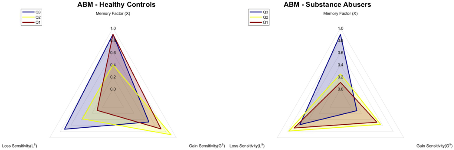 Figure 6 shows the estimated values of gain sensitivity, loss sensitivity, and memory factor used for the predictions of Figure 5. The parameters for the agents belonging to each of the groups were the same for every agent. It is important to highlight that, despite having the same parameters per group, each agent can vary their preference throughout the blocks, as shown in the dispersion bars in Figure 5. The memory factor of the Q3 (M = 0.90) and Q1 (M = 0.90) subgroups in the ABM-Healthy Control group was higher compared to the Q2 subgroup (M = 0.40). Results suggest that weighing past value is relevant to changing the preference. For the ABM-Substance Abusers group, the memory factor of the Q2 (M = 0.40) and Q1 (M = 0.11) subgroups was lower than the value of the memory factor of the Q3 (M = 0.90) subgroup. The agents of the ABM-Substance Abusers group weigh more the present consequences. Regarding Gain Sensitivity, agents from the Q2 (ABM-Healthy Control: GS = 0.90, ABM-Substance Abusers: GS = 0.56) and Q1 (ABM-Healthy Control: GS = 0.71, ABM-Substance Abusers: GS = 0.49) subgroups tend to be more sensitive to rewards than the agents in the Q3 subgroup (ABM-Healthy Control: GS = 0.48, ABM-Substance Abusers: GS = 0.11). Results suggest that agents with a lower relative preference for advantageous choices tend to weigh more the gains, even if they are not optimal in the long run. Finally, for the ABM-Healthy Control group, the loss sensitivity was higher in the Q3 (LS = 0.72) and Q2 (LS = 0.38) subgroups compared to the Q1 subgroup (LS = 0.10). Regarding the ABM-Substance Abusers group, the loss sensitivity remained within similar ranges (Q1: LS = 0.68; Q2: LS = 0.78; Q1: LS = 0.57). It is important to note that agents without memory issues and a lower relative preference for advantageous choices show less sensitivity to losses.