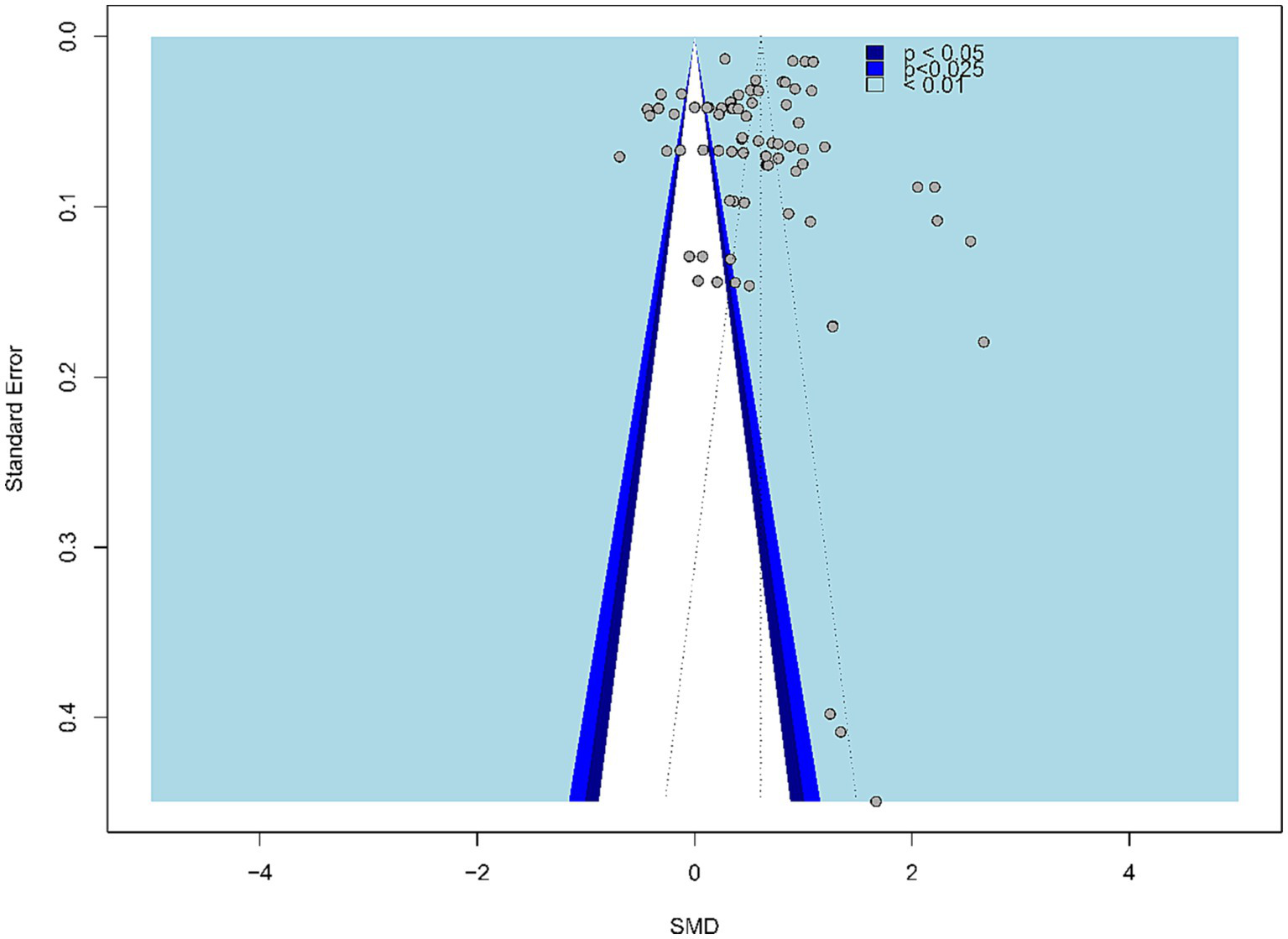 To assess publication bias, we first created a funnel plot, as shown in Figure 2. Intuitively, the funnel plot shows asymmetry, indicating that potential studies may be missing on the left side. As unpublished studies are more difficult to obtain, this study only obtained a small amount of gray literature from ResearchGate and Google Scholar, which may be the reason for the asymmetry of the funnel plot.
