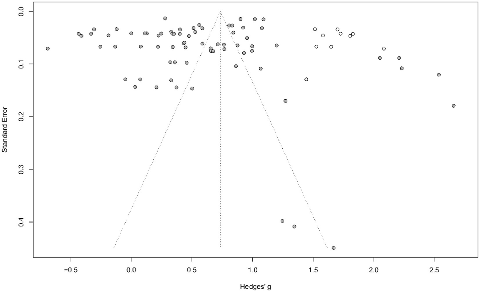 The study conducted an Egger’s test to statistically argue for the possible meaning of the funnel plot. The results of the Egger’s test showed that publication bias did not have a significant effect on the overall effect (t = −1.202, p > 0.05), suggesting that no publication bias effect was found. In addition, this study used the tinkering method (Trim and Fill) to explore the number of potential studies that were not included, and the forest plot after tinkering is shown in Figure 3. The results of the Trim and Fill method predicted that potentially 10 studies were not included, and the total effect estimate of the Trim and Fill was SMD = 0.74, 95% CI [0.59, 0.89], p < 0.001, which further affirmed the current conclusions, although heterogeneity remained high (I2 = 99.4%, p < 0.001). As the patch method is an idealized effect size recommendation, overall, the publication bias profile of this meta-analysis was good.