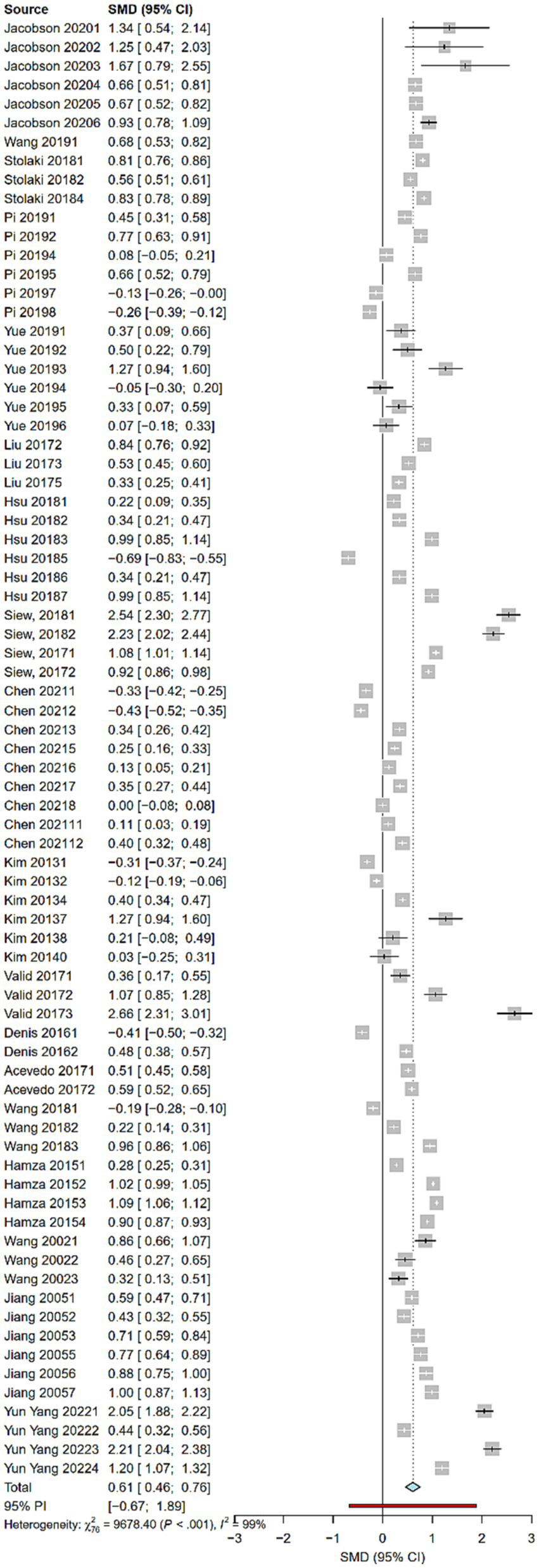 To visualize the results more, we plotted a forest plot covering all the included studies, and presented information on individual study effect sizes, confidence intervals, and heterogeneity, as shown in Figure 4. In terms of heterogeneity (Q = 9678.40, p < 0.001) and (I2 = 99.2%, p < 0.001). The data indicated significant differences in effect sizes between studies, meaning that there was a great deal of heterogeneity across studies. Therefore, further examination of heterogeneity is warranted. In order to explore the causes or sources of heterogeneity, subgroup analyzes were conducted in this study for different moderator variables.