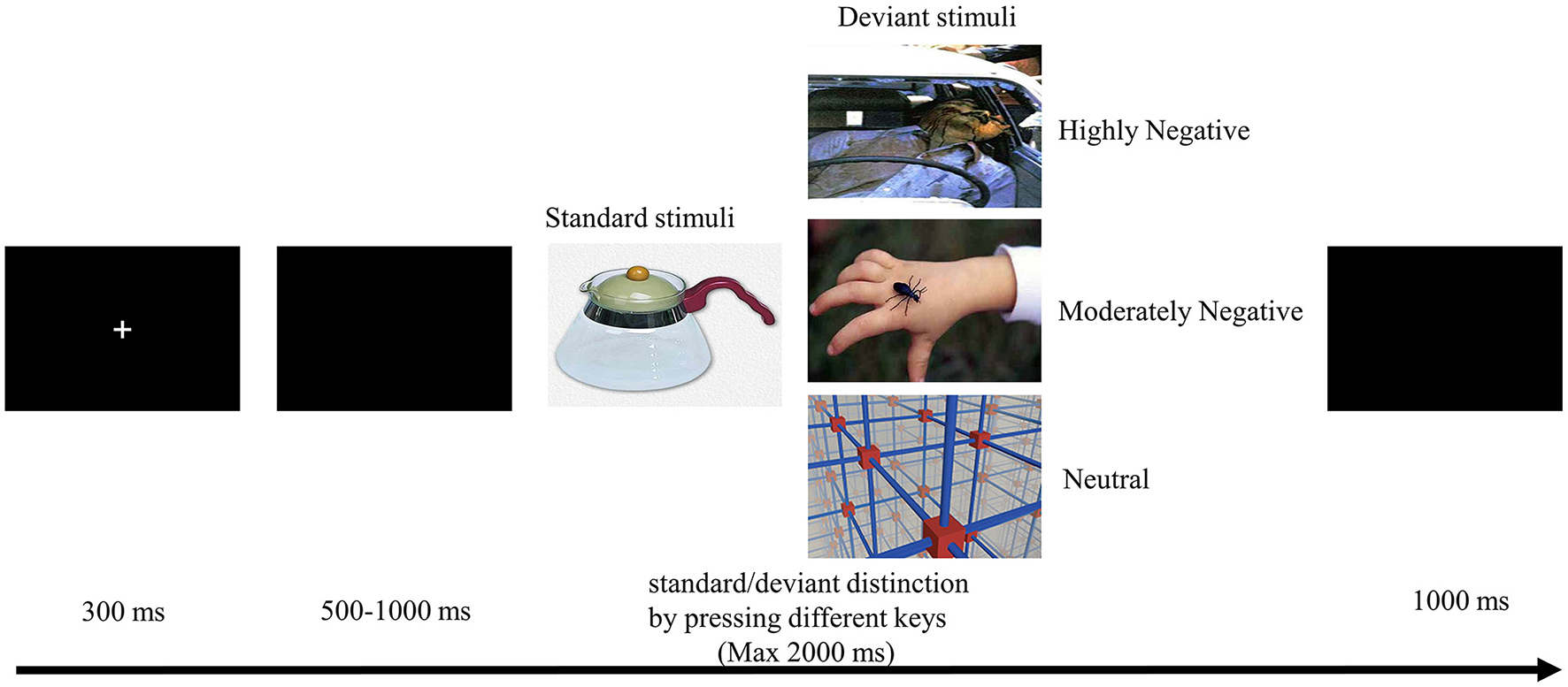 As depicted in Figure 1, each trial commenced with a 300 ms fixation cross, succeeded by a blank screen with variable duration (lasting between 500–1,000 ms). Subsequently, a 2,000 ms image was displayed, and participants were instructed to promptly and accurately respond by pressing the “F” key for standard stimuli or the “J” key for deviant stimuli. An intertrial interval of 1,000 ms was incorporated. The images were presented in a randomized sequence, and the assignment of response keys was counterbalanced across participants. Prior to the formal experiment, participants underwent 10 practice trials to acquaint themselves with the task.