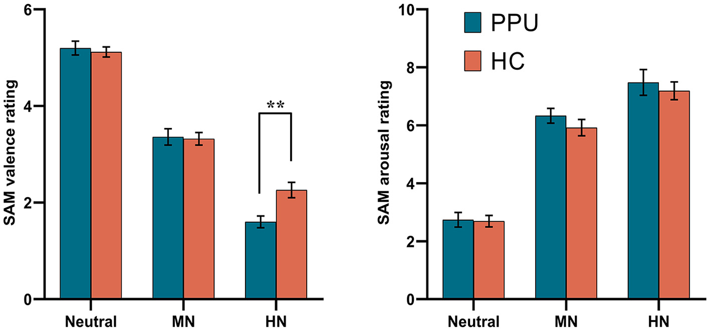 Self-Assessment Manikin (SAM) ratings by the three picture categories for PPU participants and HCs. Error bars represent one standard error. **p < 0.01.