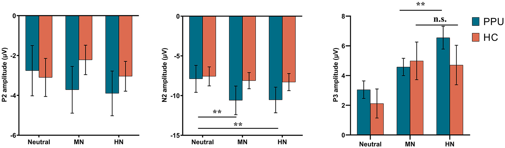 ERPs amplitudes by the three picture categories for PPU participants and HCs. Error bars represent one standard error. **p < 0.01.