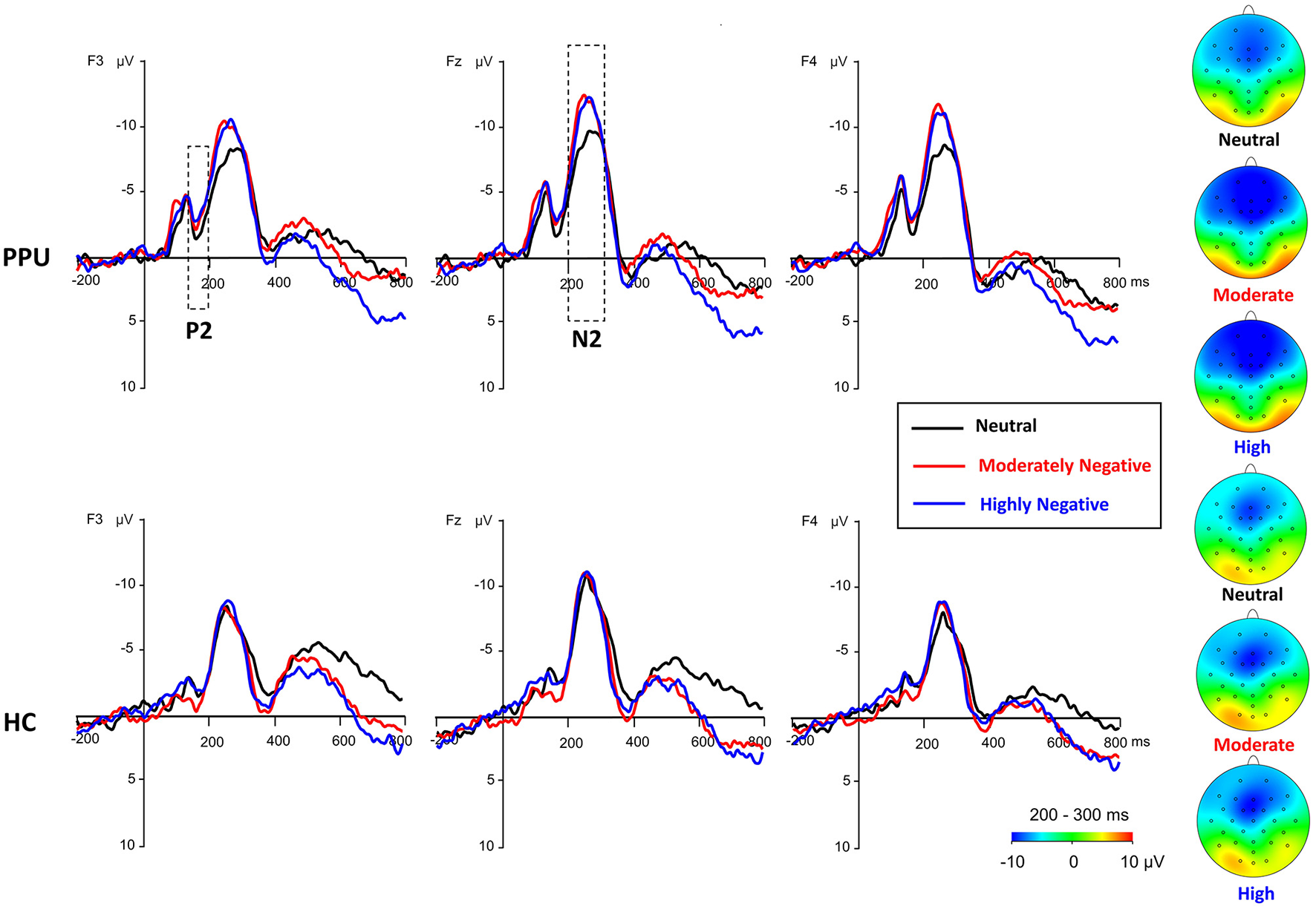 Waveforms and topography of the frontal P2 and N2 components for the PPU participants and HCs under the HN, MN, and neutral conditions for electrodes sites at F3, Fz, and F4. The N2 topography was calculated by averaging the data at 200–300 ms after picture onset.