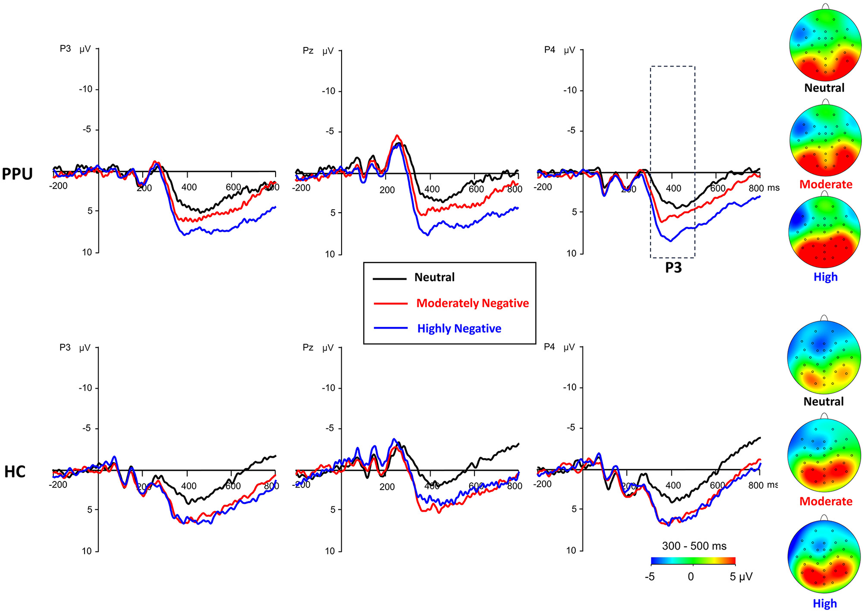 Waveforms and topography of the parietal P3 component for the PPU participants and HCs under the HN, MN, and neutral conditions for electrodes sites at P3, Pz, and P4. The P3 topography was calculated by averaging the data at 300–500 ms after picture onset.