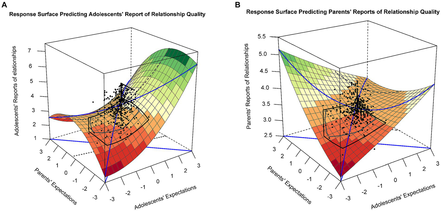(A) Response surface for the polynomial regression of educational expectations predicting adolescents’ reports of parent–child relationships. (B) Response surface for the polynomial regression of educational expectations predicting parents’ reports of parent–child relationships.