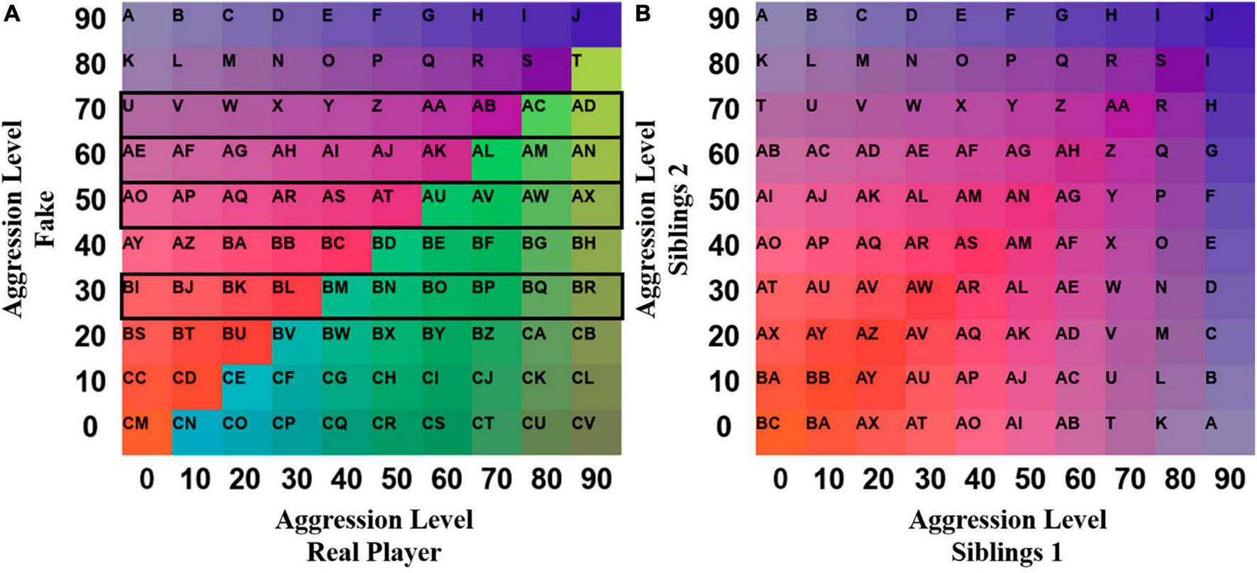 Depiction of the color-letter grids for the distinguishable and indistinguishable GSA approach. Each cell was labeled with successive letters or letter combinations from the English alphabet to handle sequence formation. The specific colors are chosen for visualization purposes only and have no innate relationship to the observation scale. (A)Distinguishable pairs: In this grid, the violet-orange color scheme represents the fake opponent having higher aggression scores than the actual player, while the blue-green scheme represents the opposite pattern. Due to the fixed nature of the five fake trials, only the scores on the highlighted rows were feasible. (B)Indistinguishable pairs: In this grid, combined trial-based observation scores between members are absolute, as the player ascribed to the x-axis and y-axis is interchangeable. Cell labels and colors are mirrored diagonally. Each base color corresponds to a different provocation level, and the shade indicates the relative aggression score of the other sibling. Shades containing a higher proportion of white are associated with a higher difference in aggression scores between siblings, while shades with a lower amount of white indicate more balanced aggression scores.