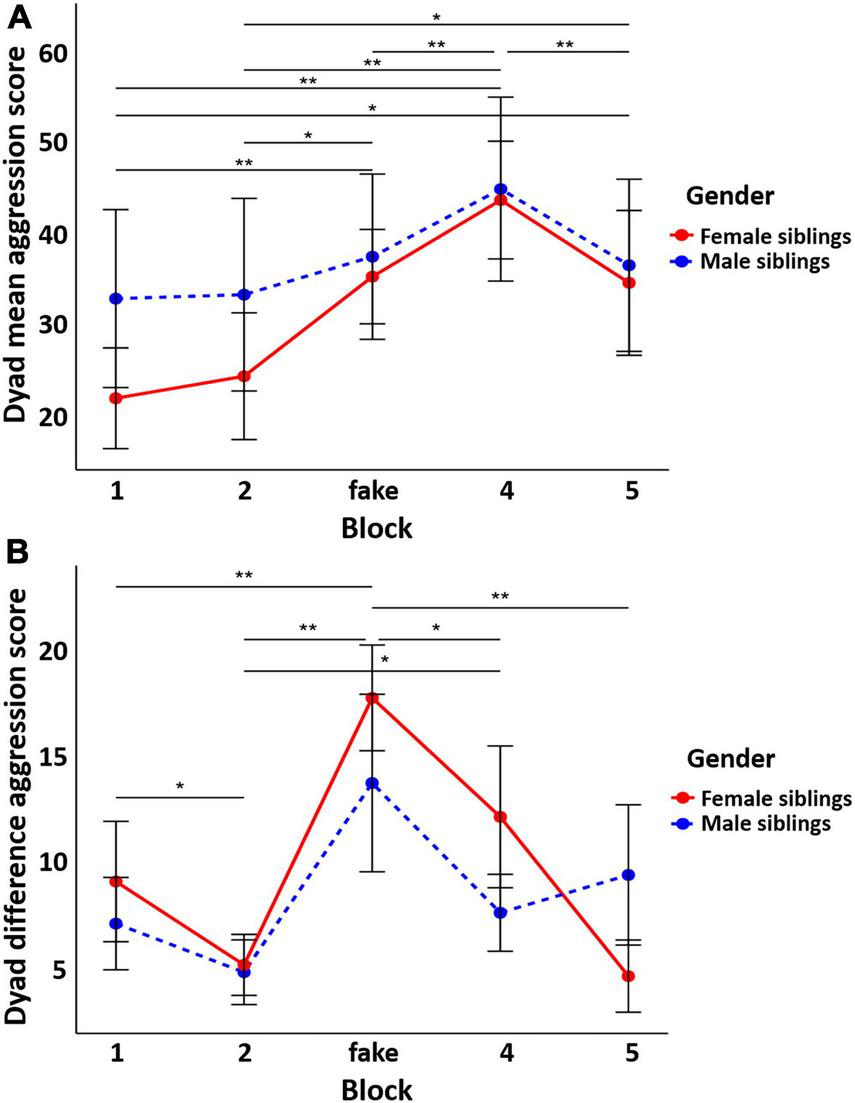Dyad mean (A) and difference (B) aggression scores across blocks separately for male and female sibling pairs. No significant gender difference was found. Error bars represent the 95% confidence intervals around the mean values. * p < 0.05 and ** p < 0.01.