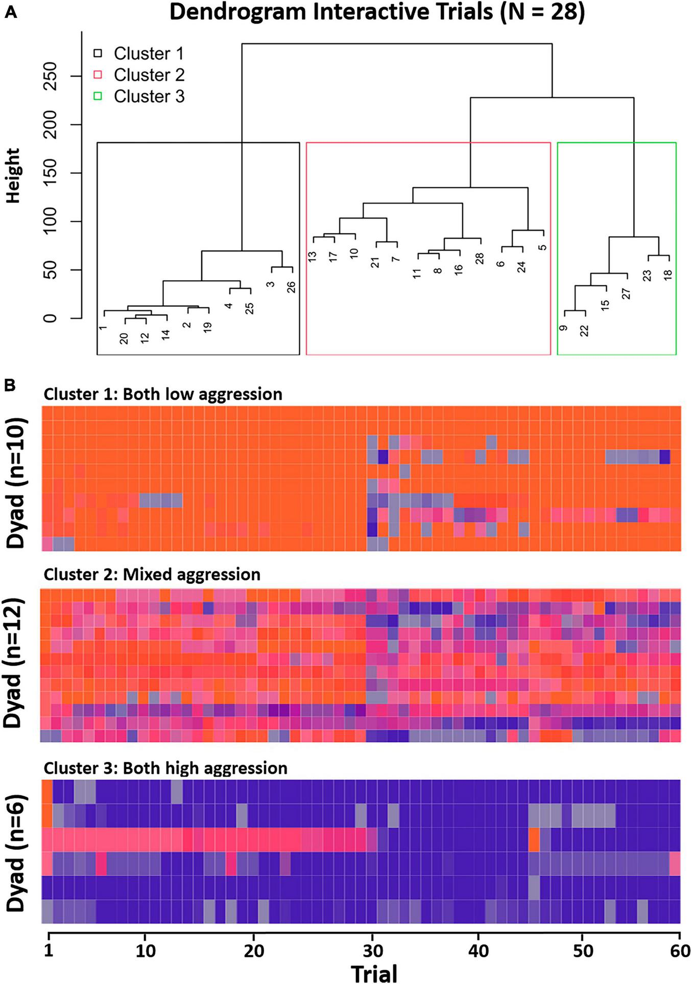 (A) Dendrogram interactive trials (distinguishable). (B) Sequences per cluster depicting interactive aggression scores over trials (from left to right). Cluster labels are for description only.