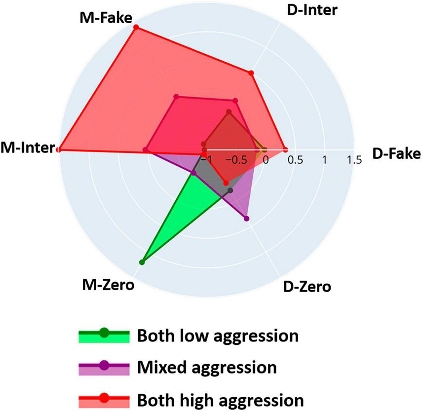 Descriptive statistics, distribution details, and results of normality checks for mean aggression scores across all trials, interactive trials, and fake trials, along with the frequency of “Zero Aggression Trials,” are summarized in Supplementary Table 5. Information on dyads’ mean and difference aggression scores is also provided.