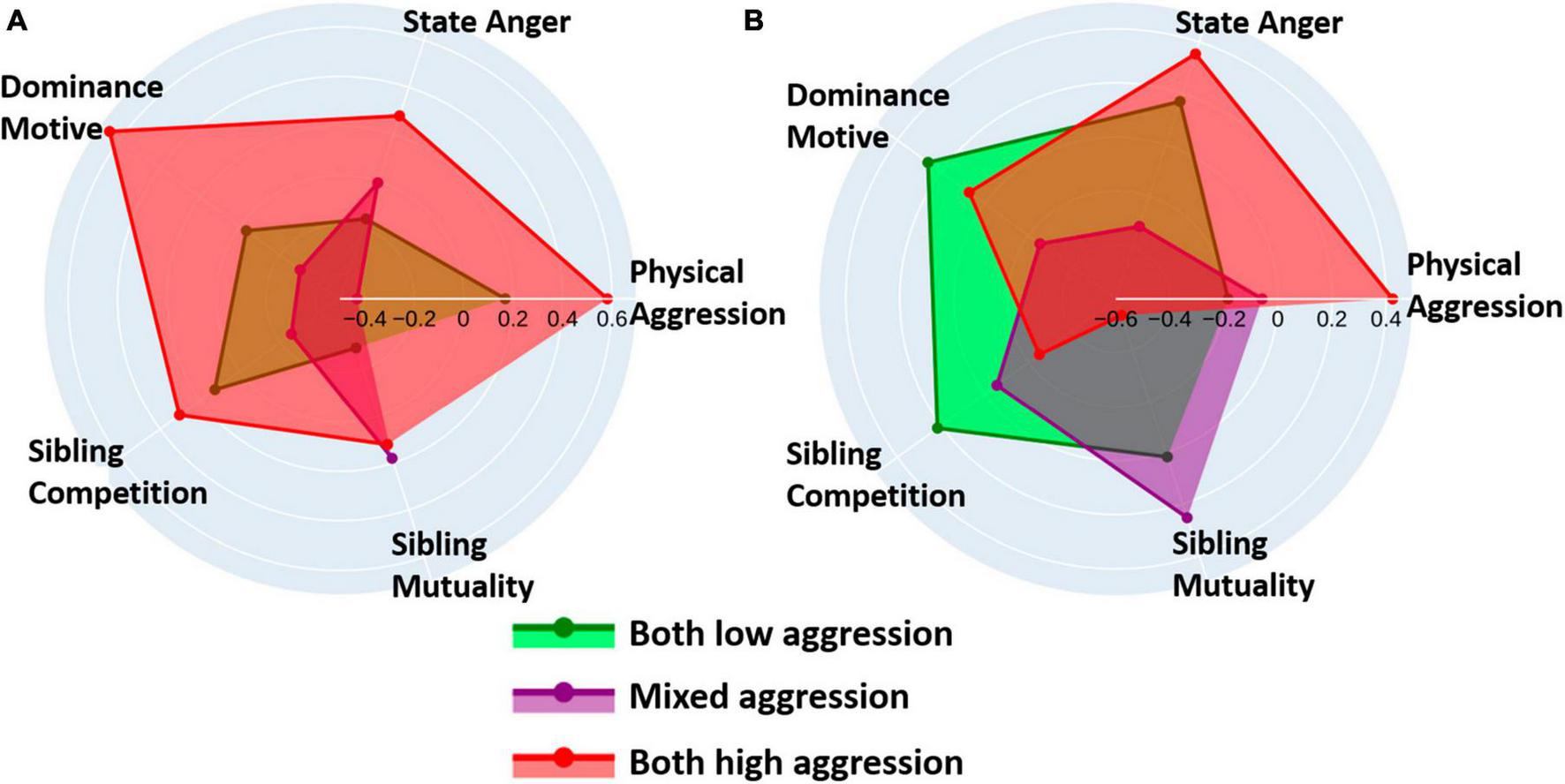 We anticipate that subgroups of siblings will employ either a mutual consent strategy ("Fairness strategy"), characterized by a shared level of aggression, or a divergent strategy ("Competitive strategy"), characterized by trial-based differences in aggression levels between members, reflecting siblings’ cooperative and competitive nature (Hamilton, 1964; Neyer and Lang, 2003; Salmon and Hehman, 2015). We expect that clusters will differ in sibling relationship ratings as well as overall traits related to aggression and dominance. For example, clusters with lower aggression levels may have higher mean positive sibling relationship scores, while clusters with higher aggression levels may have higher levels of sibling conflict and rivalry. Further, we expect that sibling clusters using a tit-for-tat strategy and potential revenge-related behavior are likely to have higher levels of overall dominance traits or a significant difference in this trait between members (Tucker et al., 2010; Suessenbach et al., 2019).