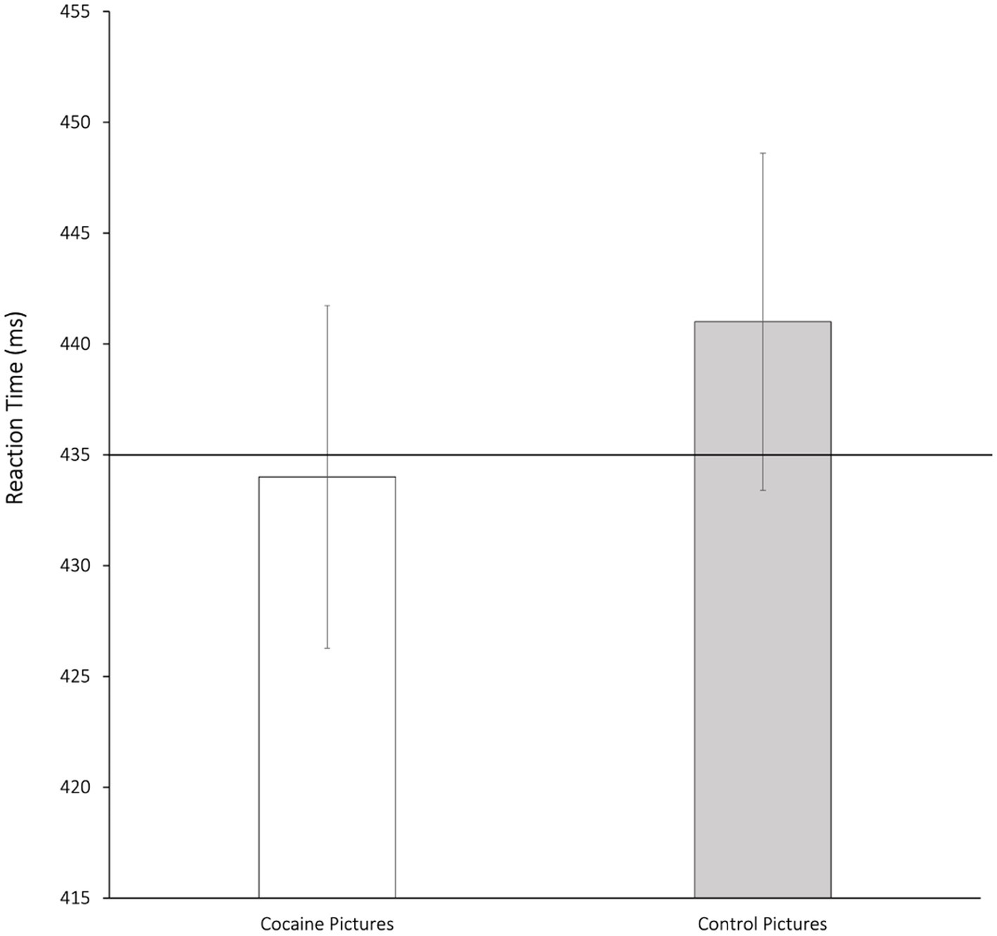 Mean reaction times (ms) and standard errors to probes replacing 500 ms-presented cocaine-related pictures and matched control pictures compared to reaction times on neutral-neutral trails (horizontal line) in the overall sample (n = 47).