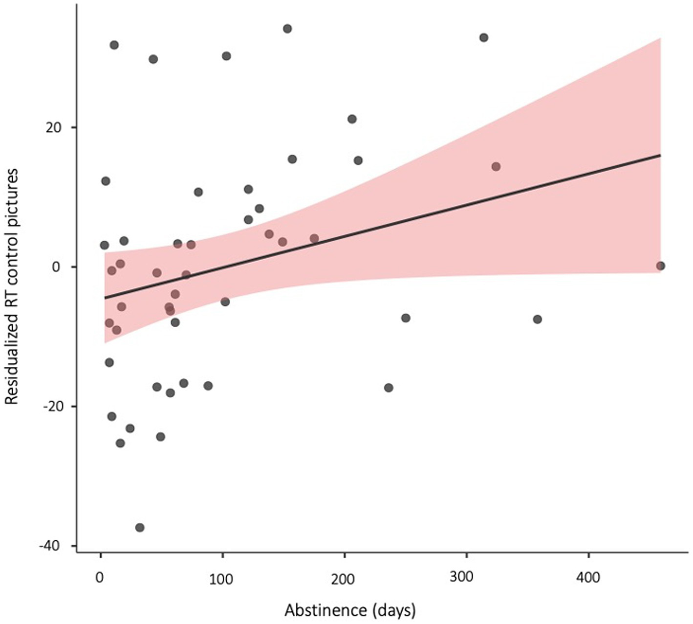 Scatterplot depicting the correlation between abstinence duration (days) and residualized reaction times to probes replacing 500 ms-presented matched control pictures (controlling for age, gender, and reaction times on neutral-neutral trails).