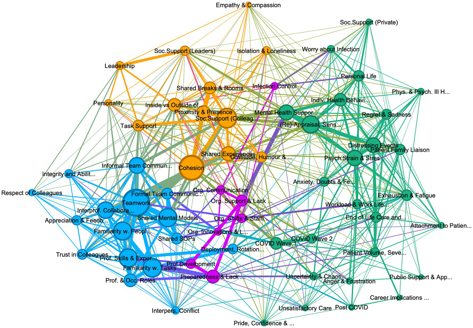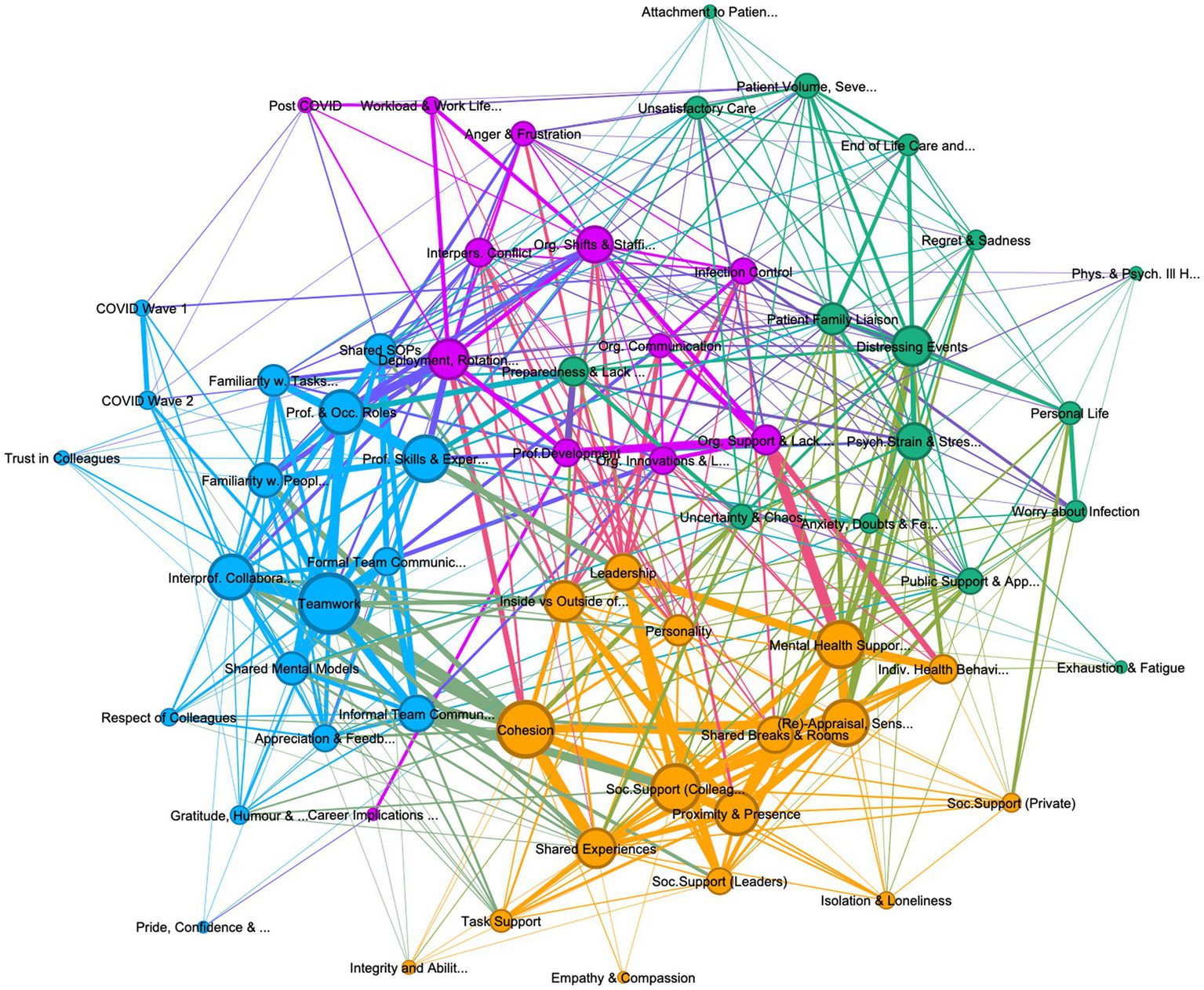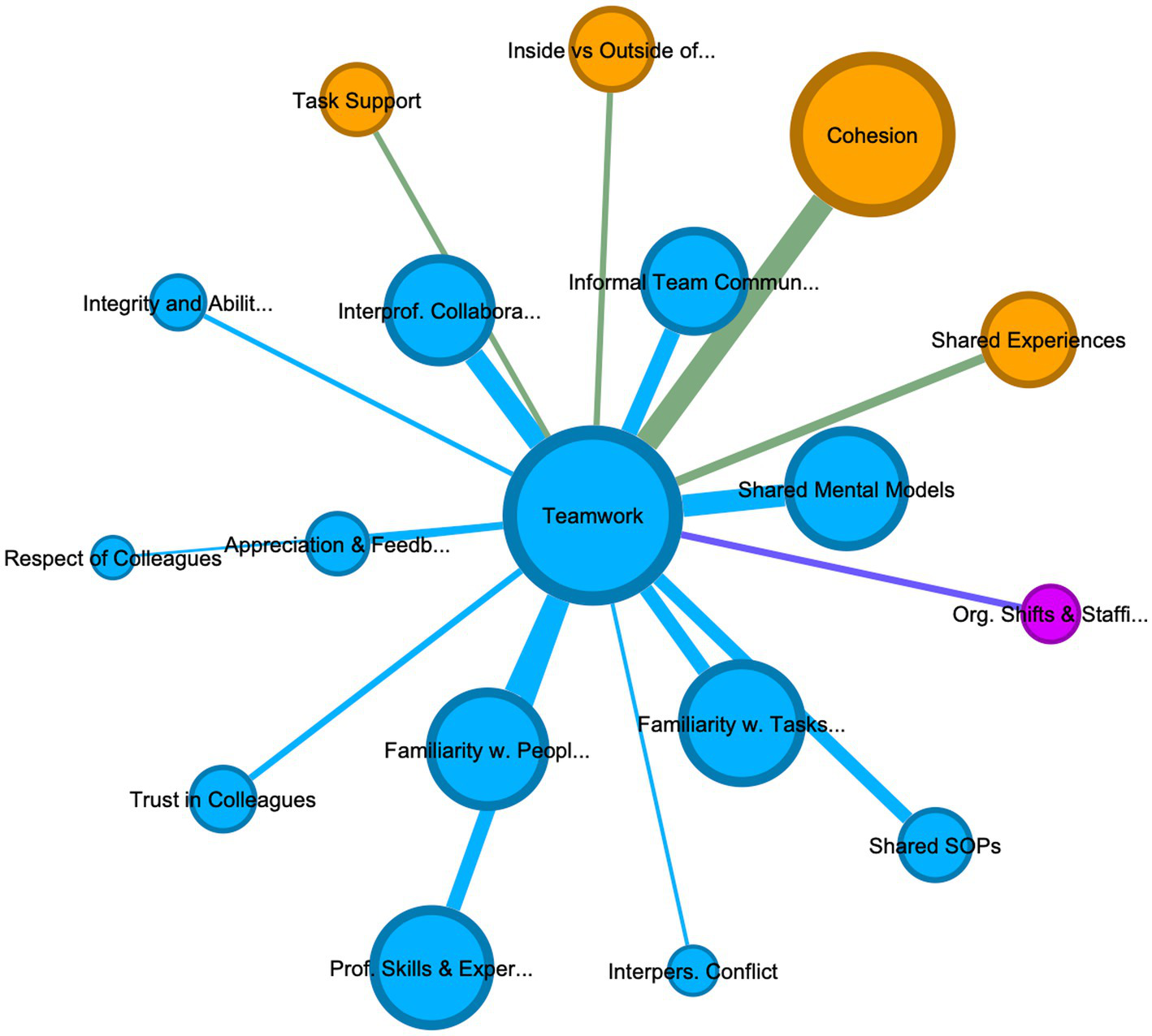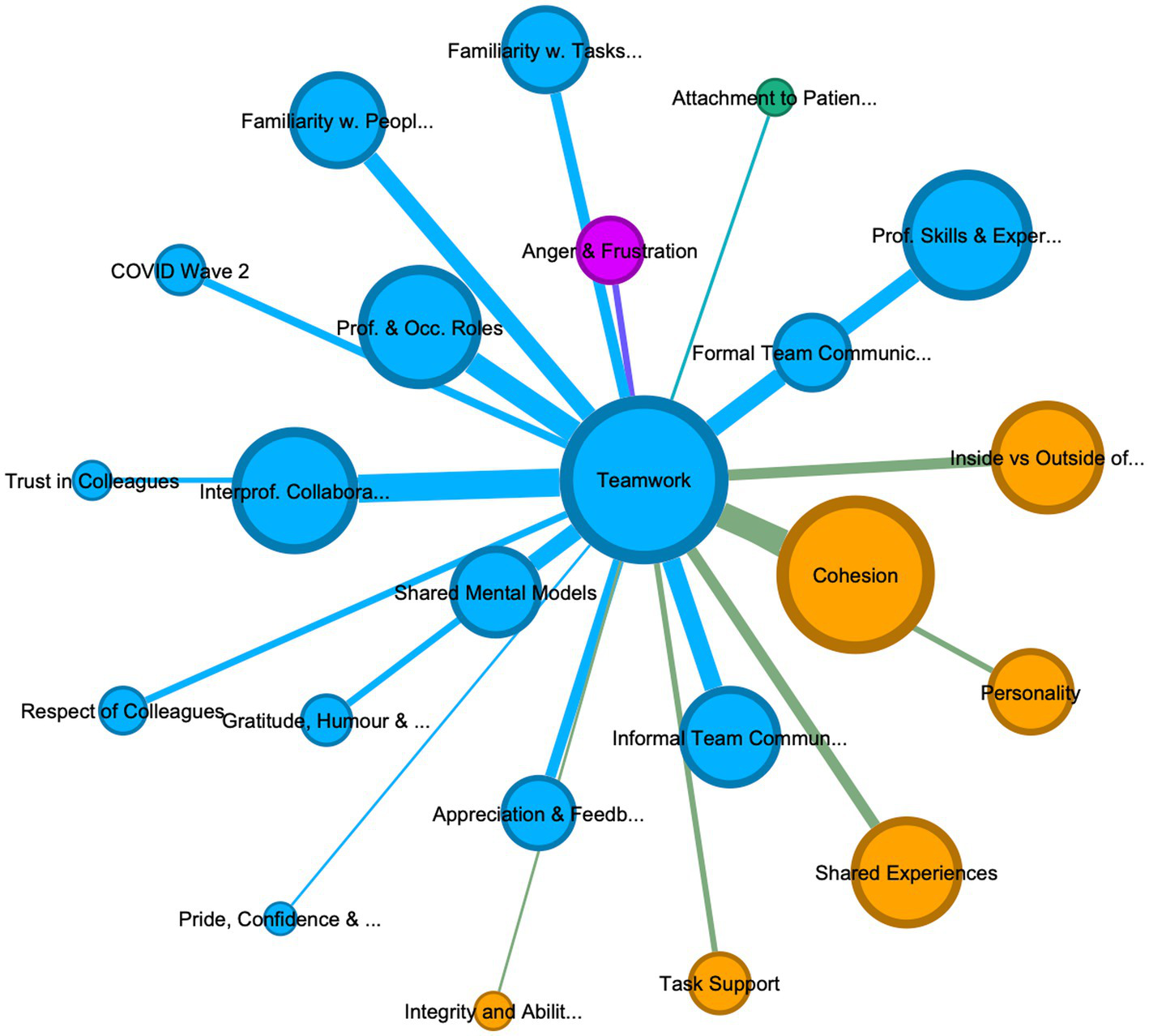 The qualitative interviews were analyzed using a Thematic Network Analysis approach (Pokorny et al., 2018; Schilling, 2022), which first investigated the transcripts via thematic analysis, using NVivo (release 1.6.2; Woolf and Silver, 2017; QSR, 2020). Transcripts were double-coded by two experienced coders (SS, MA) using a sequential deductive exploratory coding method, by which we coded the transcripts (a) using the 13 themes identified in our prior systematic literature review (e.g., “shared mental models” (Cannon-Bowers et al., 1993; Salas et al., 2016), “formal communication”, “cohesion” (Schilling et al., 2022) as initial deductive coding guide, which was then extended upon through (b) inductive coding focused on themes emerging from the data, reflective of the topics brought forward by the participants (Braun and Clarke, 2012; Braun and Clarke, 2021), and not previously identified as deductive themes (e.g., “familiarity with tasks”, “inside vs. outside of ward”). To maintain the context and reflect human speech, whereby a speech fragment is discussing several different themes simultaneously, the data was coded en-bloc (e.g., one paragraph) and against all potential codes within that paragraph (e.g., Teamwork, Leadership, Anger and Frustration. Supplementary Table 5). The resulting codes were tested for inter-rater reliability, before the deductive and inductive themes were merged and synthesized to ensure they adequately represented the interviewees’ narrative accounts. The final 80 thematic codes were presented to the study’s advisory board and an expert panel of healthcare professionals who verified and confirmed them.