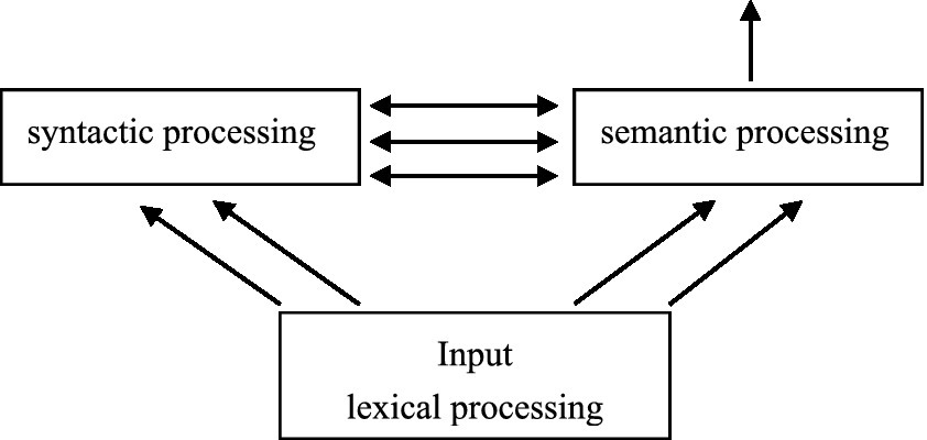 As an alternative view, the interactive model, together with the constraint-based lexicalist model (MacDonald et al., 1994), the concurrent model (Boland, 1997), the non-syntactocentric dynamic model (Kuperberg, 2007), rejects the assumption of syntactic primacy. It divides language comprehension into three phases. During the first phase, the initial syntactic structure is constructed based on word category. During the second phase, lexical-semantic and morphosyntactic processing takes place together for the goal of thematic role assignment. During the third phase, varieties of information integrate with each other. Overall, semantic information can guide and contribute to the syntactic processing in language comprehension, which is manifested by such questions as how much information of word orders can be derived from semantics.