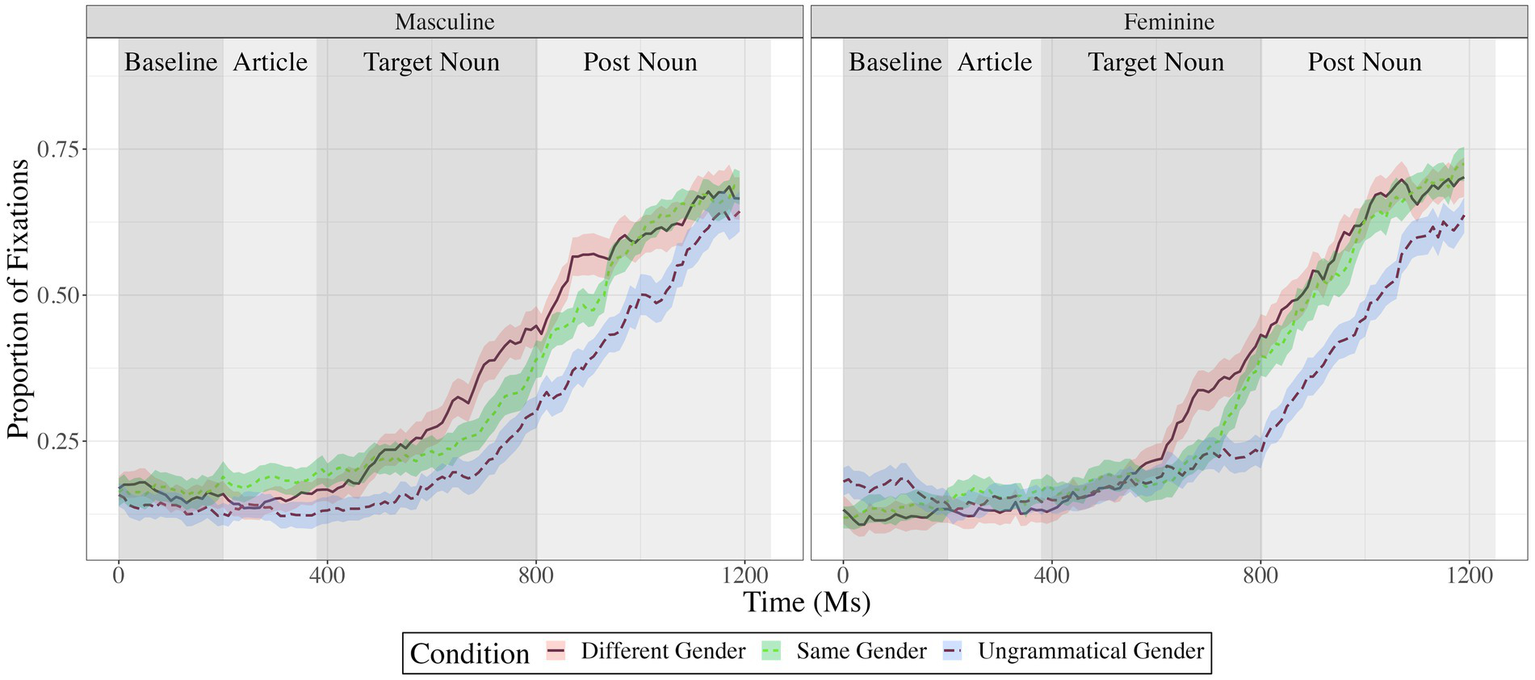 Proportion fixations to target in the different-gender (solid red), same-gender (dotted green), and ungrammatical gender (dashed blue) conditions, as a function of time in milliseconds, separately for targets with masculine gender (left panel) and feminine gender (right panel). Error ribbons represent ±1 standard error of the mean.
