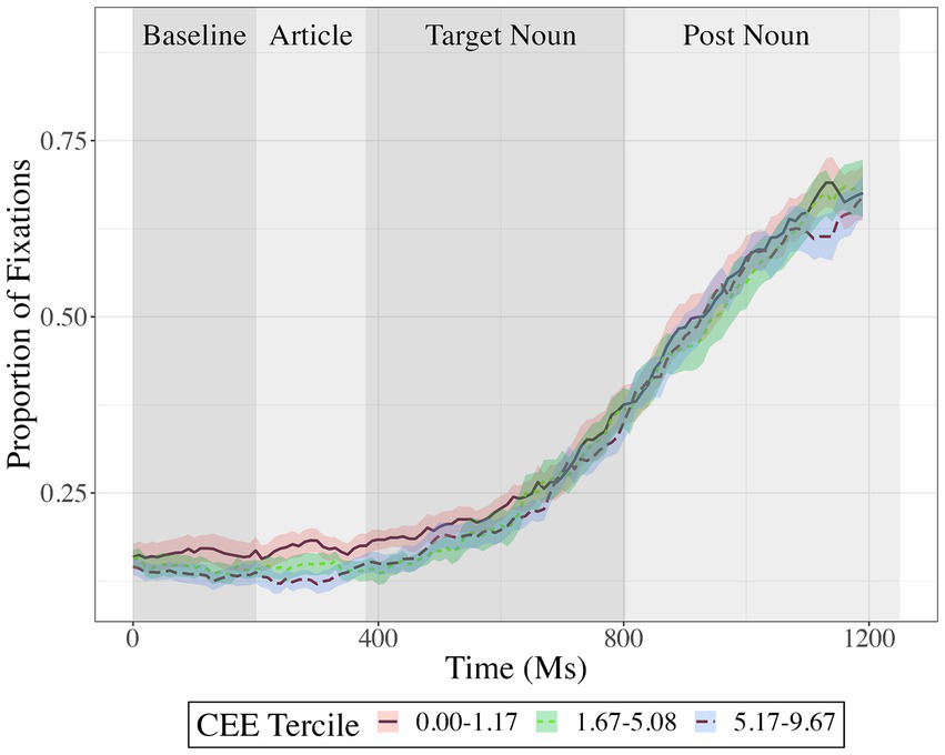 Proportion fixations to target, averaged across conditions and as a function of time in milliseconds, separately for participants based on their cumulative English exposure (CEE) residualized on age: low residual cumulative English exposure (CEE; solid red; n = 17), medium residual CEE (dotted green; n = 17), or high residual CEE (dashed blue; n = 17). Analyses treated CEE as an unresidualized continuous variable; however, participants were grouped into three bins for visualization and residualized to highlight the variance uniquely explained by CEE. Error ribbons represent ±1 standard error of the mean.