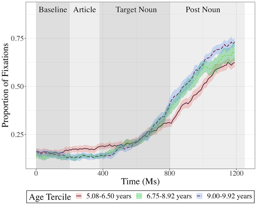 Additionally, relative to younger children, older children with low cumulative English exposure looked at the target noun significantly more overall during the post-noun region. Thus, older children are more accurate and look to the target nouns faster. Although monolingual children acquire grammatical gender earlier and more accurately than heritage Spanish speakers, all children in this study showed stronger lexical processing when they were older. In previous studies, children showed adult-like processing of grammatical gender but were slower than the adults, potentially due to children’s slower speech processing speed and cognitive resource limitations (Lew-Williams and Fernald, 2007; Snedeker and Huang, 2015; Brouwer et al., 2017). Even though in our study we did not compare children to adults, we do see a similar difference between younger and older children.