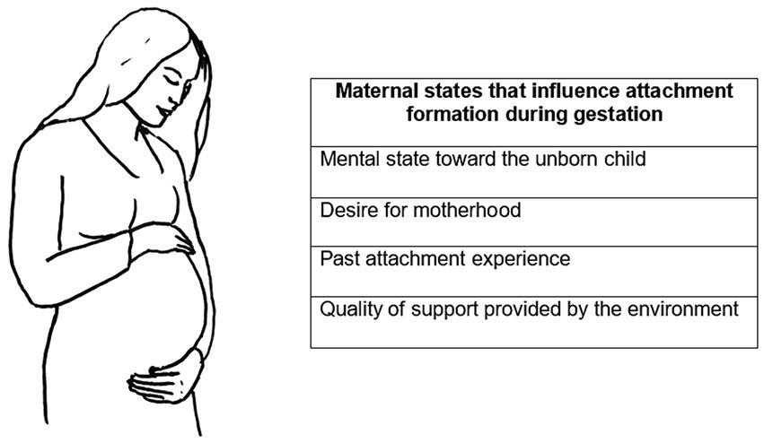 An integrated theoretical framework could contribute to another significant aspect of attachment research: its evolutionary origins. Here the question is: when do we start to build an attachment system? Bowlby (1969/1982) originally described attachment development as a process of progressive stages that take place during the first three years of life (Ainsworth et al., 1978). However, the study of attachment has more recently been extended to the prenatal period, and it is well accepted that factors including the mother’s mental state toward the unborn child, her desire for motherhood, her past attachment experience, and the quality of support provided by the environment, affect the development of postnatal attachment (Cranley, 1981; Zimerman and Doan, 2003; Smorti et al., 2020) (see Figure 2).