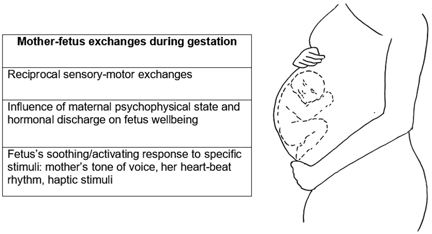 The fetus uses information gathered during intrauterine life to predict the safety of the external environment and to address specific caregiving figures after birth. This is evident from their retainment of familiar voices and a preference for the smell and voice of the mother (DeCasper and Fifer, 1980; Fifer and Moon, 1988; Sai, 2005; Vaglio, 2009; Streri et al., 2013).