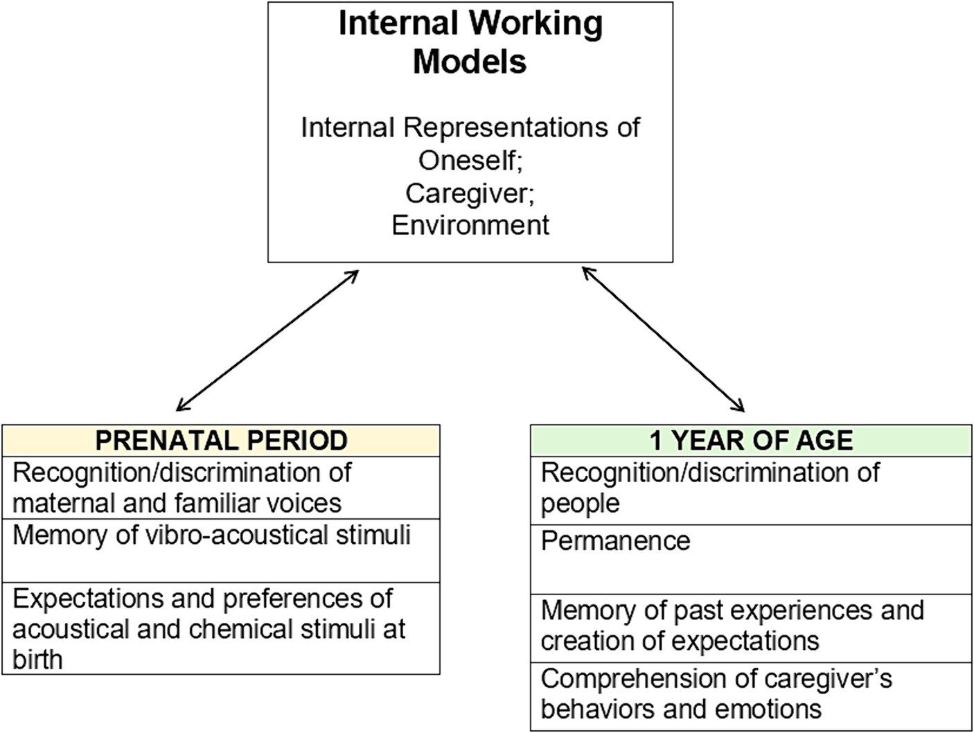 From the cognitive functioning perspective, it appears plausible that a child in the first year of life is capable of constructing mental representations. The formation of IWM in infants is linked to the formation of cognitive capacities such as the recognition and discrimination of persons, their permanence, the memory of past experiences, the creation of expectations based on experience, and the understanding of the meaning of caregiver’s behaviors and emotions. Infants as young as the first month of life can recognize and discriminate between faces, and by 4 months of age, they can retain memories of social events that generated a stress response for 15 days. By the third month of life, the maturation of implicit memory is completed, and there is a progressive complexification of motor sequences that can demonstrate its existence. Infants build different expectations based on past experiences with specific adults and can predict future caregivers’ behaviors. Social expectations could be innate, and infants as young as 9 months have demonstrated expectancies on positive social behaviors while observing conflict in an interactive group of adults (Sherman et al., 2015). It’s even hypothesized that such representations may start forming prior to birth. However, mental representations alone may not fully explain the intricate dynamics that shape an individual’s organization, including early experiences, child-specific traits, and environmental events. Embodied cognition is a field of cognitive science that emphasizes the importance of the body and environment in cognitive abilities. It suggests that mental processes are not solely computational, and the brain is not the only seat of cognition. Crossing the neurobiology perspective, the embodied approach could shed light on how sensory and metabolic information imbues certain multi-domain acquisitions with meaning (Petters and Waters, 2014; Beckes et al., 2015; Atzil et al., 2018). We propose that attachment and its embodied patterns could start evolving during pre-natal period, influenced by the neurochemical and sensory input the fetus and then the infant receives.