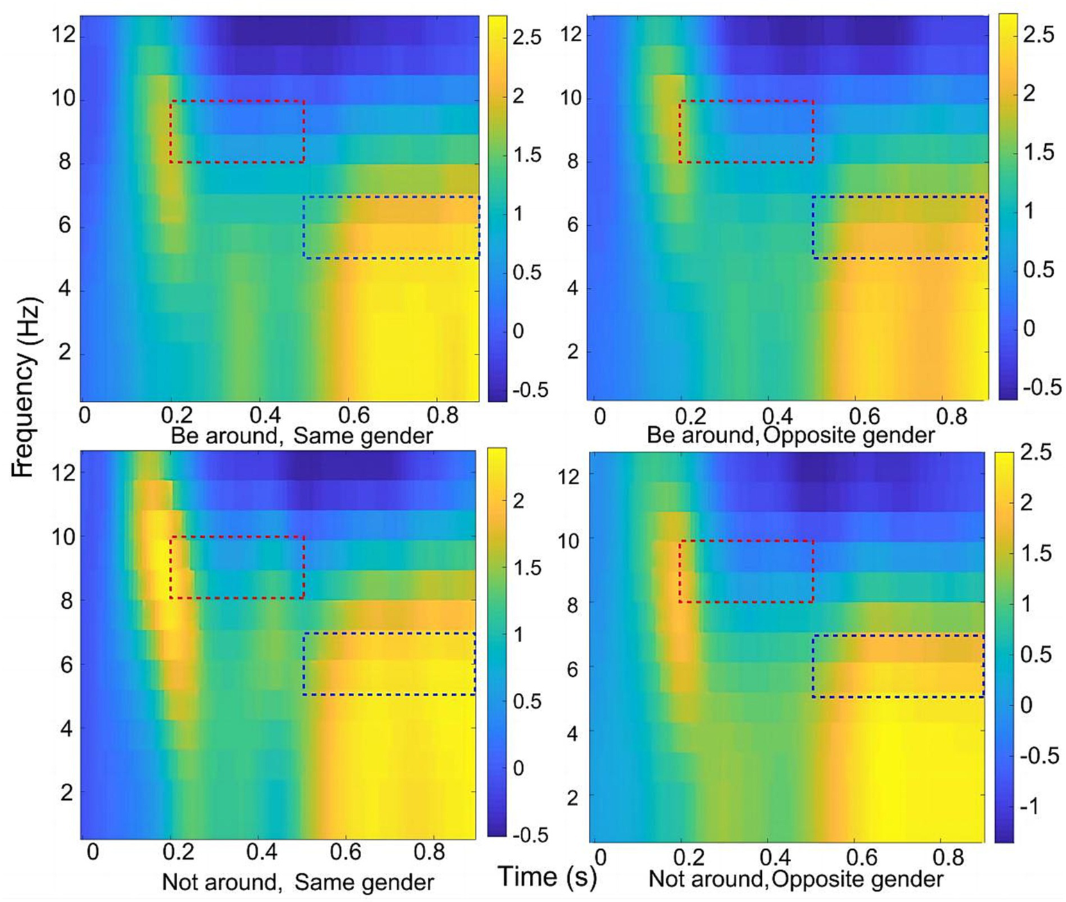 Mean time-frequency chart of the whole brain. The red box indicates the time period during which there is a significant difference in brain activity in the Alpha frequency band, while the blue box indicates the time period during which there is a significant difference in brain activity in the Theta frequency band.