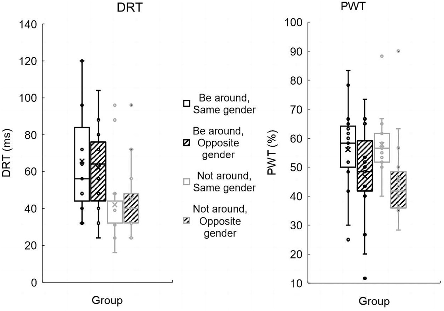 A boxplot representation of behavior results. The left side represents the behavioral results of DRT, and the right side represents the behavioral results of PWT. The 25th and 75th quartiles and the “whisker” showing the 5th and 95th percentile.
