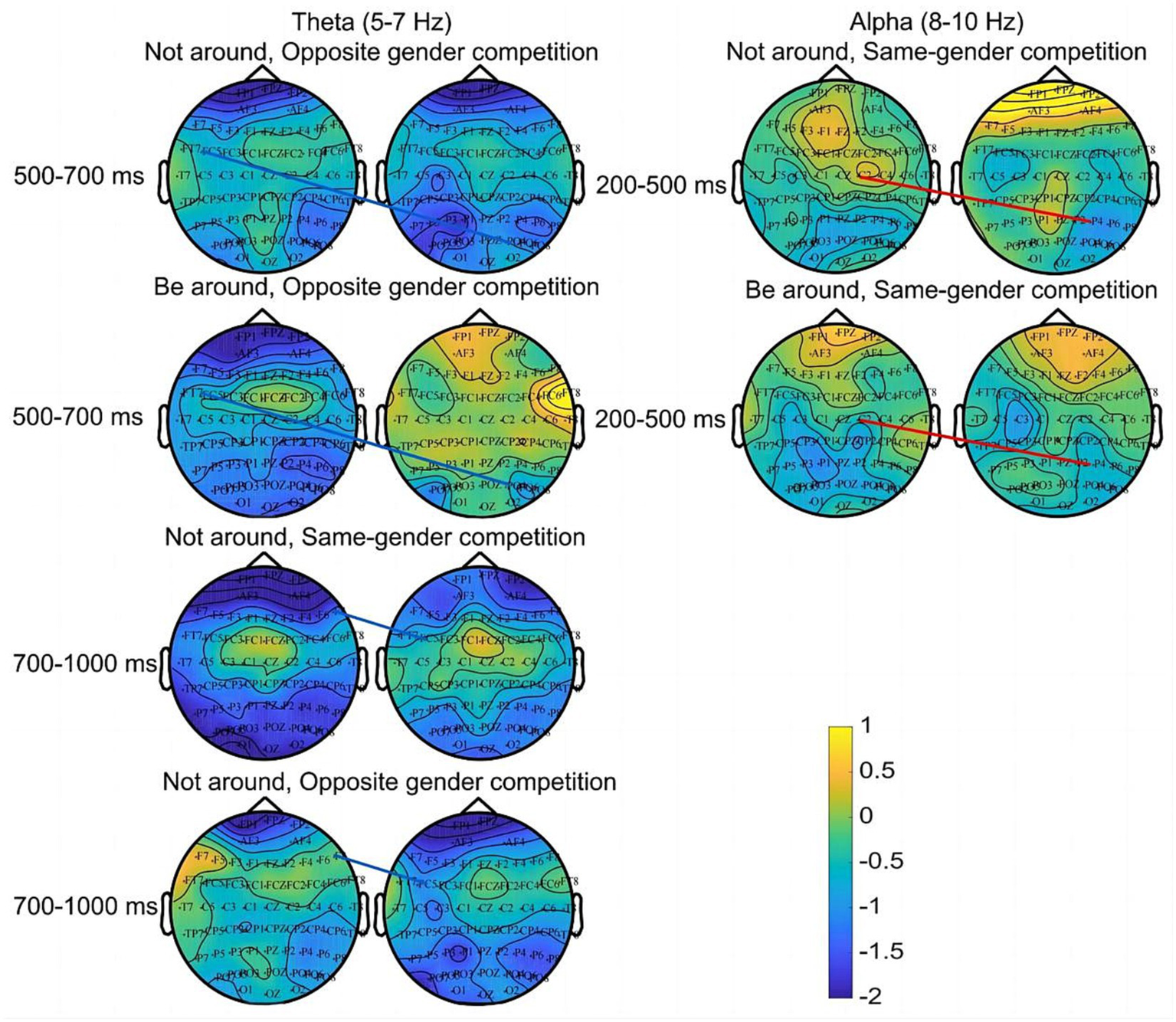 Neural synchrony is a characteristic of interpersonal relationships, but the cognitive neural mechanisms underlying how intimate relationships influence females’s competition remain unclear. Previous theories have suggested that an participant’s efforts in competitive interactions can result in a certain degree of overlap between their brain activity and that of their interaction partner (Gugnowska et al., 2022; Chang et al., 2023). There is evidence that when participants receive positive feedback in competitive contexts, compared with cooperative contexts, the Theta band activity in the frontal lobe exhibits greater interbrain synchronization. With the improvement of subjective consciousness, the interbrain synchronization of participants in a competition decreases (Balconi and Vanutelli, 2018). The relationship between interbrain synchronization and external performance demonstrates the presence of a link between cognitive ability and the Theta frequency band, which plays a role in interbrain synchronization. In addition, Putri et al. (2022) found that in competitive interactions, the winner may monitor the opponent’s activity. Alpha frequency band activity is related to participant perception and consciousness. Additionally, research has revealed that the interbrain synchrony of individuals is influenced by the synchronization of competitive behavior and also by the dynamics within the competitive group (Gamliel et al., 2021). In other words, when individuals compete within their own group as opposed to competing with an external group, their behavior and brain synchronization are higher. This suggests a close association between interbrain synchrony and the interaction within the competitive group.
