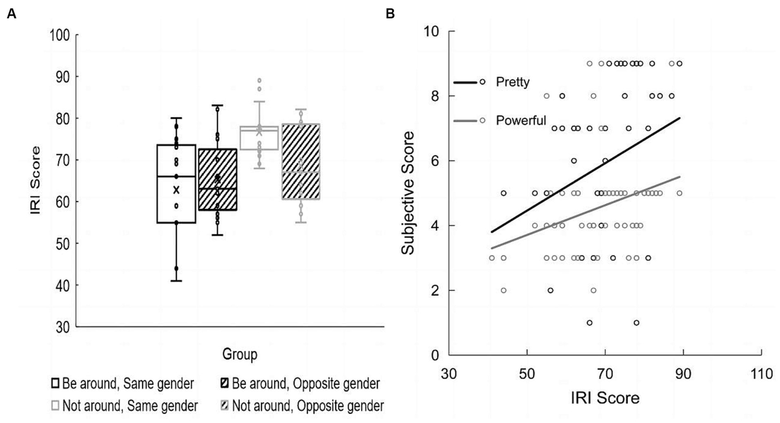 (A) Subjective measurement results. The 25th and 75th quartiles and the “whisker” showing the 5th and 95th percentile. (B) Subjective measurement correlation. The correlation between IRI score and face value and ability.