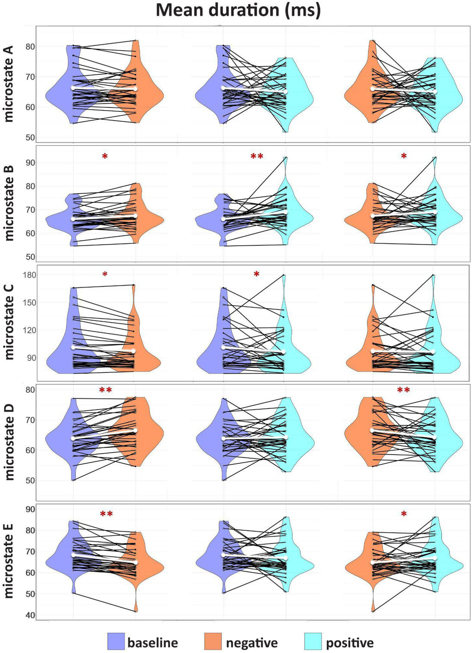 Results for microstates mean duration (ms). Group comparison of the distribution and the median of the mean duration (ms) of each identified microstate fitted for BAS, NEG, and POS. Intercategorically connected black points represent intra-individual data; the median is represented in white. The significant differences are marked with *p < 0.05, **p < 0.001.