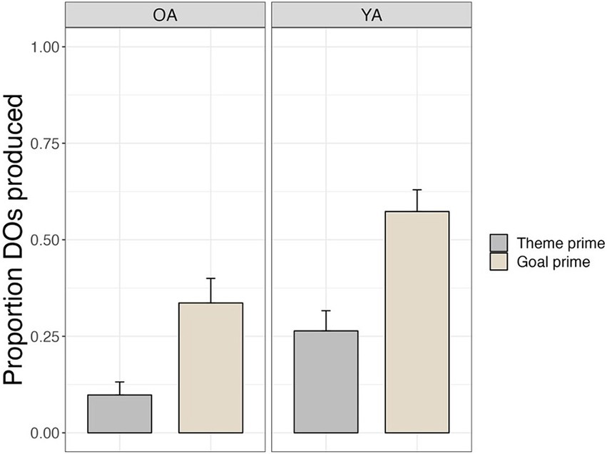 Figure 3 shows the proportion of double object (DO) productions out of total dative (double object and prepositional object) productions for older and younger adults in the goal prime condition vs. the theme prime condition. Both groups displayed priming effects, producing significantly more DO sentences in the goal prime condition (Older adults: 34%, SE = 6%; Younger adults: 57%, SE = 6%) compared to the theme prime condition (Older adults: 10%, SE = 3%; Younger adults: 26%, SE = 5%; β = 2.33, SE = 0.48, z = 4.81, p < 0.0001). Younger adults produced more DO sentences overall compared to older adults (β = 1.94, SE = 0.66, z = 2.92, p = 0.004). The interaction between group and prime condition was not significant (β = −0.39, SE = 0.48, z = −0.81, p = 0.42). Post hoc tests showed that older and younger adults both showed significant priming effects (older adults: β = −2.34, SE = 0.48, z = 4.88, p < 0.0001; younger adults: β = −1.96, SE = 0.38, z = 5.20, p < 0.0001).