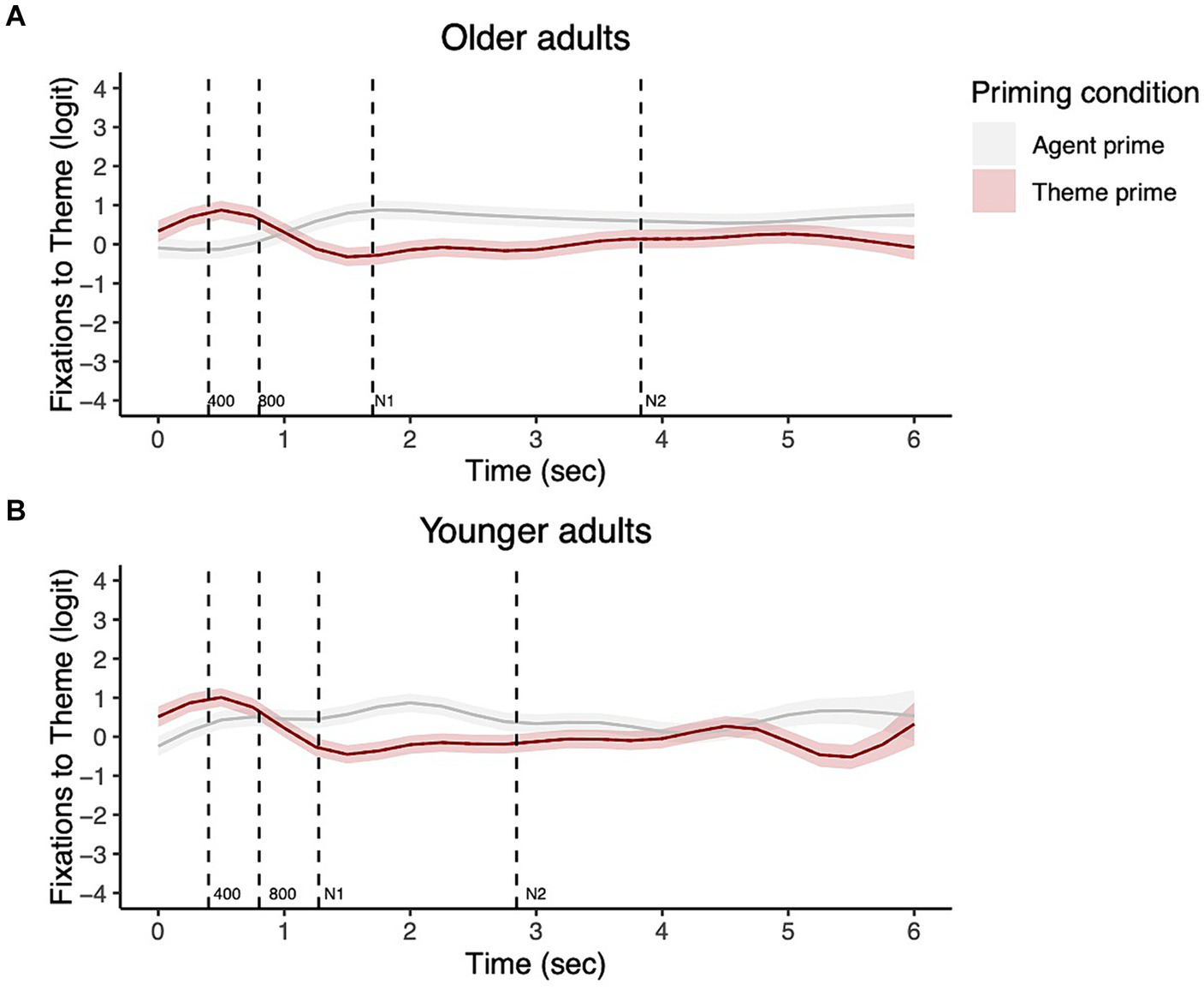 For each time window, the models first tested whether each group showed significant priming effects. There was a significant priming effect for both groups in the 0–400 ms time window such that the participants showed more fixations to the theme in the theme vs. agent prime condition, as shown in Figure 5A (Older adults: EDF = 2.00, Ref. DF = 2.00, χ2 = 7.43, p = 0.02; Younger adults: EDF = 4.10, Ref. DF = 5.01, χ2 = 23.68, p = 0.0003). In the 400–800 ms time window, both groups showed significant priming effects (Older adults: EDF = 5.90, Ref. DF = 7.23, χ2 = 51.20, p < 0.001; Younger adults: 7.42, Ref. DF = 8.76, χ2 = 156.64, p < 0.001). The statistical results for the remaining time windows (800-N1, N1–N2, N2-end of trial) are reported in Supplementary Table S1. There were still significant differences in fixations to the theme between the prime conditions, but in the direction that participants showed greater fixations to the theme in the agent vs. theme condition, as shown in Figure 4.