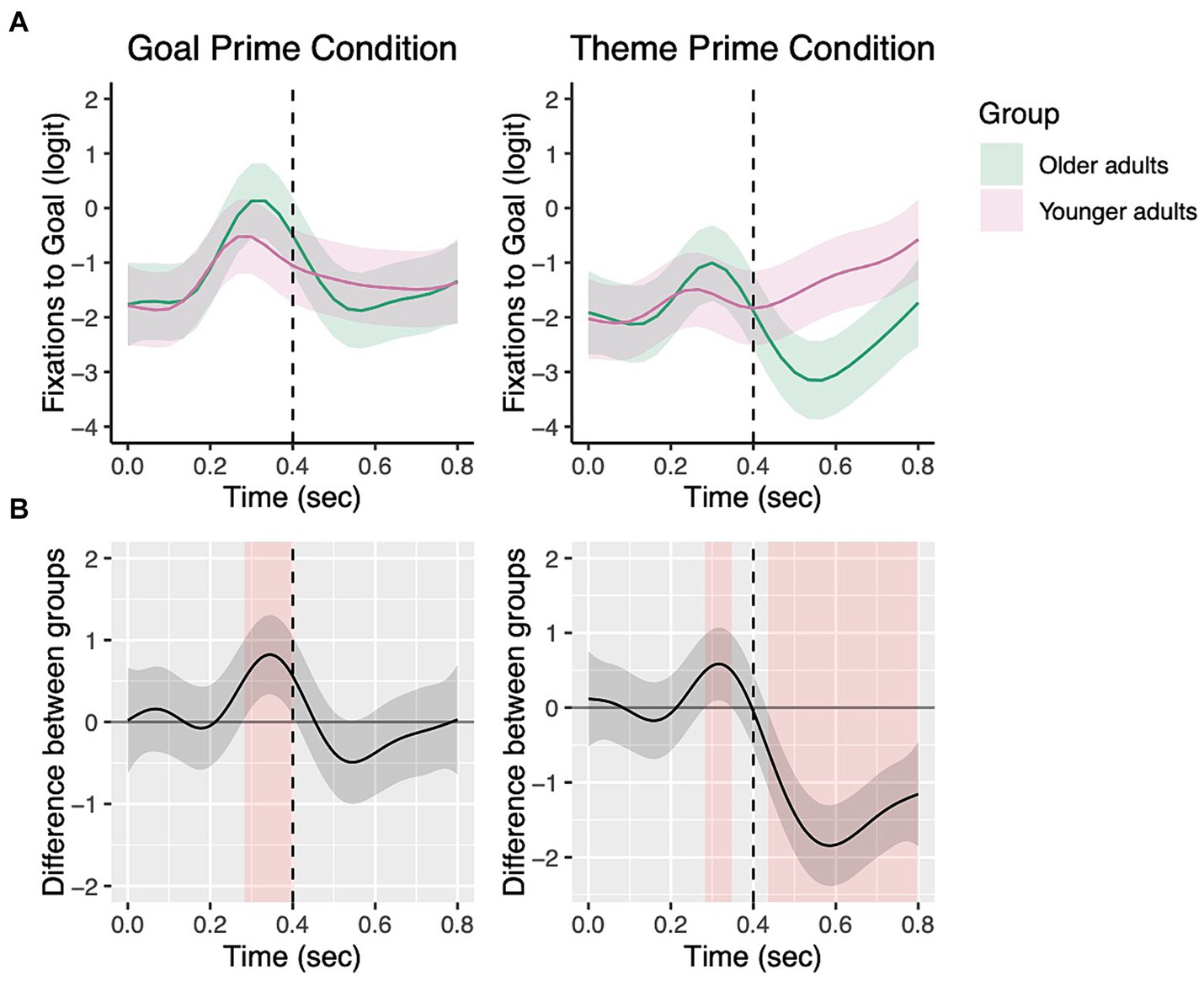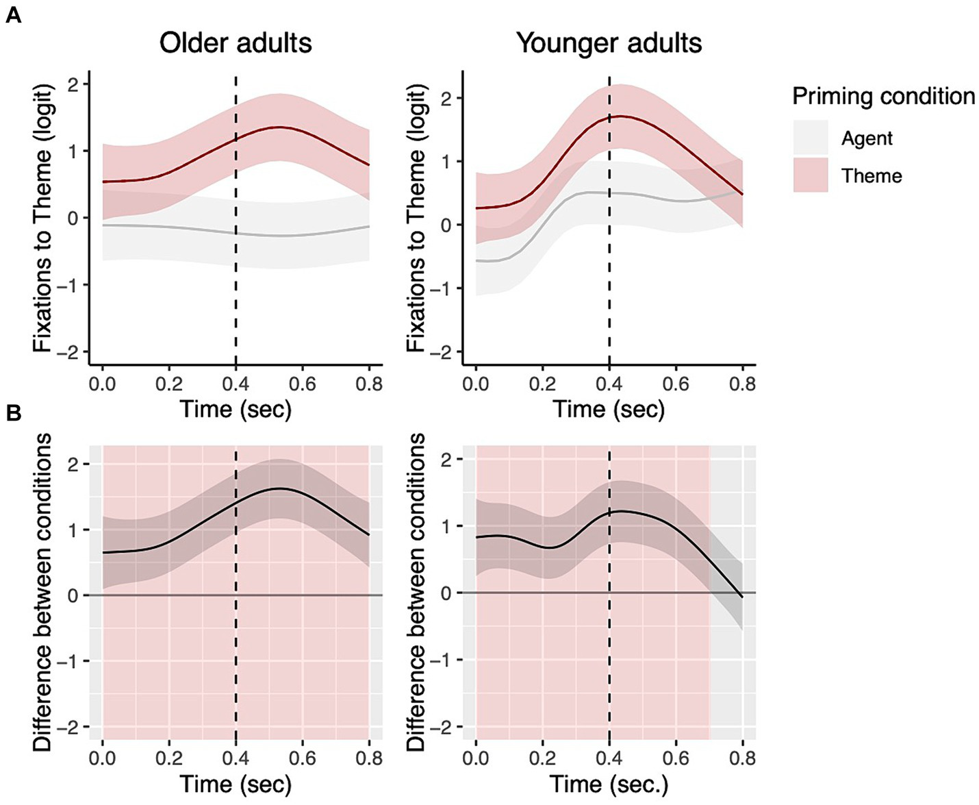 Priming effects on eye fixations from picture onset to 800 ms for transitive targets. The top panels show fixations to the theme by prime condition for each group with the dotted vertical line indicating 400 ms (A). Shading in the bottom panels (B) represent areas where the difference smooth confidence interval does not include zero.