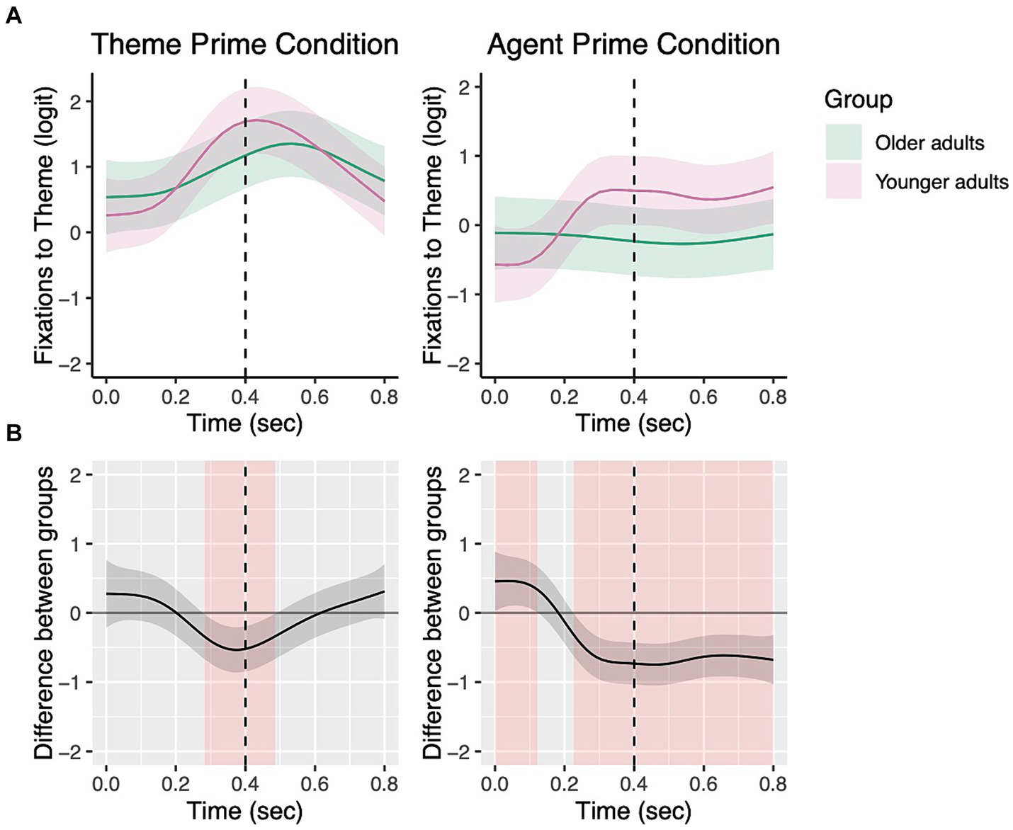 In order to measure whether the participants showed differences in their fixations to the theme from the earliest time window, we next focused on the first two sentence regions (i.e., picture onset −400 ms and 400–800 ms.). The top panels of Figure 5 show fixations to the theme by prime condition from picture onset to 800 ms. The bottom panels (Figure 5B) additionally show the difference in fixations to the theme between priming conditions for each group. Areas highlighted in red are periods where the fixations to the theme differed significantly between the two priming conditions.