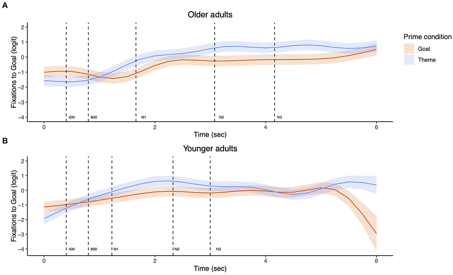 Figure 7 shows the non-linear change in fixations to the goal character over the course of a trial. Statistical results confirmed that both younger and older adults showed non-linear changes in their fixations in all conditions (Older adults – Theme prime: EDF = 8.72, Ref. DF = 8.98, χ2 = 842.20, p < 0.001; Older adults – Goal prime: EDF = 8.42, Ref. DF = 8.91, χ2 = 126.70, p < 0.001; Younger adults – Theme prime: EDF = 8.28, Ref. DF = 8.81, χ2 = 714.50, p < 0.001; Younger adults – Goal prime: EDF = 8.80, Ref. DF = 8.98, χ2 = 275.30, p < 0.001).