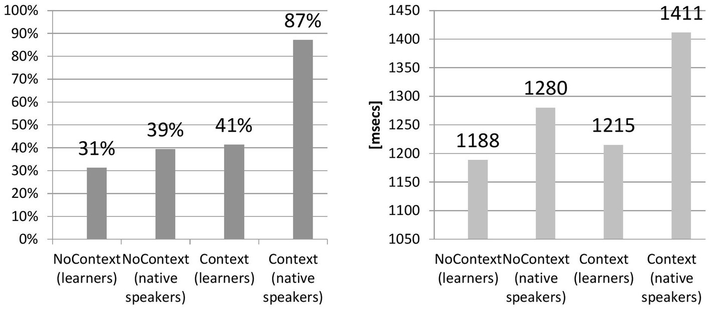 Figure 2 also suggests between-groups differences for reaction time, which were then investigated with one-way ANOVA. The compared groups of learners differ significantly, F(1,100) = 420.27, p < 0.05, allowing us to observe that the Context Group (M = 1359.31 ms, SD = 786.17, N = 50) recognized reduced forms faster than the NoContext Group (M = 1466.27 ms, SD = 605.21, N = 52). In comparison with native speakers, tokens without context were recognized slower by learners than by native speakers, F(1,75) = 314.26, p < 0.05 (learners: M = 1466.27 ms, SD = 605.21, N = 52; native speakers, M = 1284.24, SD = 179.36, N = 6). The same tendency was observed for the Context Group: F(1,75) = 24.95, p < 0.05 (learners: M = 1359.31 ms, SD = 786.17, N = 50; native speakers, M = 1411.28, SD = 469.29, N = 8). The effect size between two non-native speakers groups was not significant: r = −0.07, d = −0.14. With regard to the comparison of NoContext and Context between native speakers and learners, the effect size failed to reach any significance: r = 0.13, d = 0.41, g = 0.31 and r = 0.03, d = −0.08, g = −0.07, respectively.