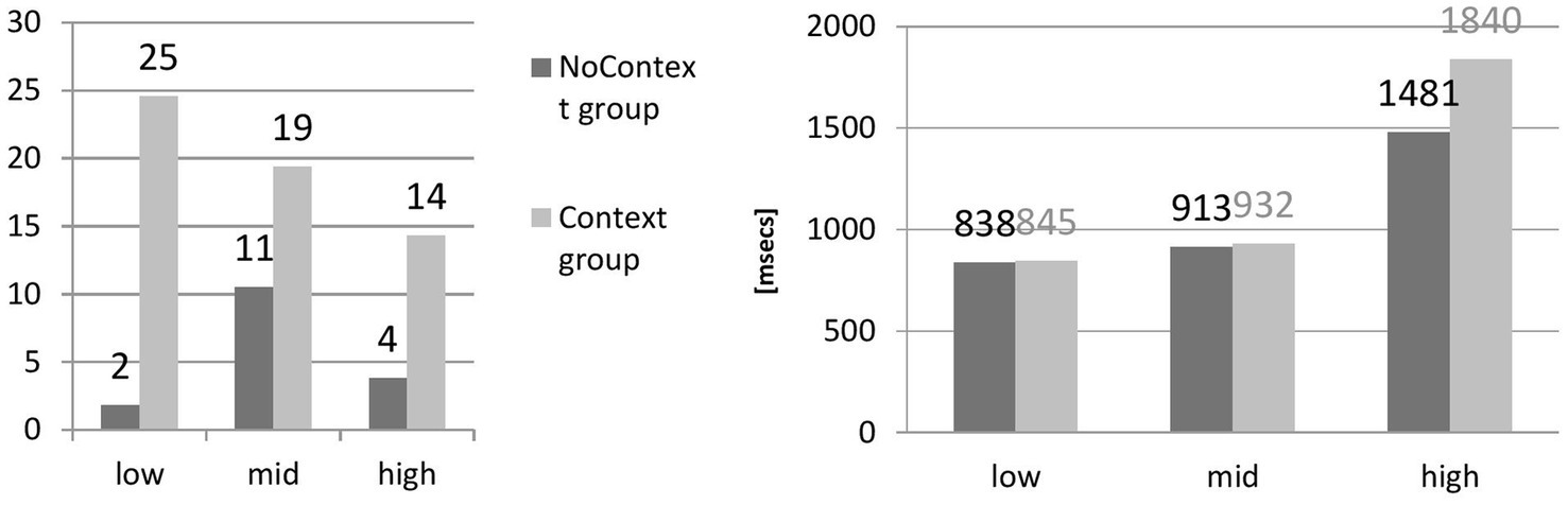 The results for Context Group (low-density: M = 25, SD = 15, N = 9; mid-density: M = 19, SD = 14, N = 10; high-density: M = 14, SD = 11, N = 10) display the tendency toward better recognition of reduced forms in shorter tokens; for NoContext (low-density: M = 2, SD = 1, N = 7; mid-density: M = 11, SD = 7, N = 6; high-density: M = 4, SD = 7, N = 7), mid-density seems to boost perception. The results are statistically significant (NoContext Group: F(2,17) =33.86, p < 0.05; Context Group: F(2,26) =21.61, p < 0.05).