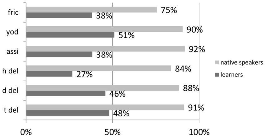 Hypothesis 2 addresses the effects of a process type. It is not unreasonable to expect that L2 listeners have a sharper perception of words with a missing sound (categorical processes) than for the potentially confusing effects of gradient processes such as place assimilation (e.g., change from /d/ to /g/), Yod coalescence (replacing /t, d, s, z/ in the vicinity of /j/ with / ʃ, ʒ, tʃ, dʒ /), or fricativization (/h/−like sound instead of a stop), which might cause perceptual difficulties. Thus, hypothesis 2 assumes that gradient reduction (fricativization, place assimilation, and Yod coalescence) is perceived slower and less accurately than the categorical one (/t, d, h/ deletion; Holst and Nolan, 1995; Hanique et al., 2013).