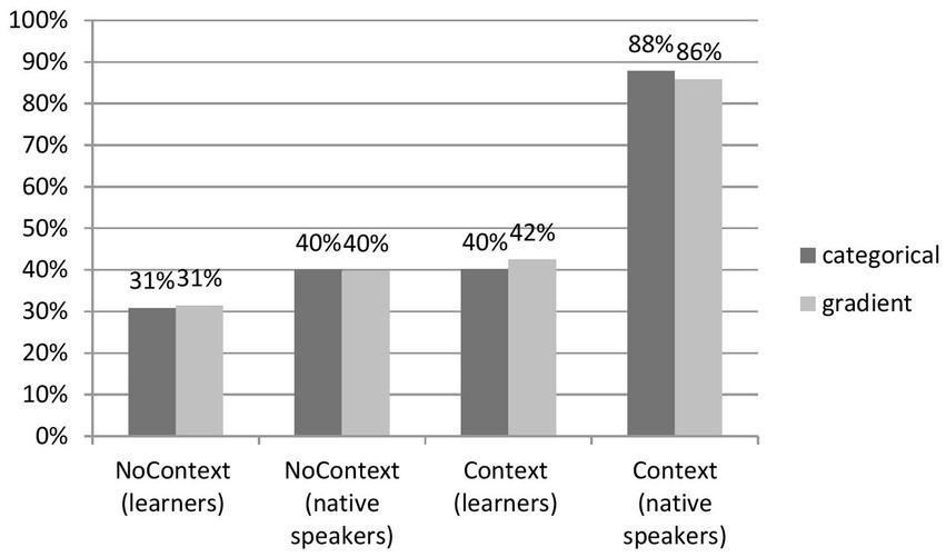 The first hypothesis predicted that the presence of lexical context boosts the perception of reduced forms. Figure 2 presents the results.