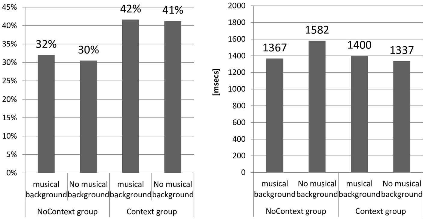 In addition, the study examines an extralinguistic factor related to the subject background, i.e., musical background by which the study understands the ability to play an instrument, either self-taught or obtained via formal music education and/or singing in a choir or a band. Musical background was established using a questionnaire, and results are reported as follows: 27 subjects from NoContext Group (52%) had musical background. However, only for 6 participants (22%) was the education formal. The duration of years spent in musical school ranged from 4 to 7 years and referred to the first degree (5.5. years on average). In Poland, there are three types of musical schools: first-degree and second-degree musical schools, which require 4 to 6 years of training, and third-degree (School of Music, 6 years) musical schools. In comparison with informal musical education (e.g., private lessons), the musical school offers an intensive program (courses at least twice a week), including theoretical modules such as rhythm, harmony, and composition. In the Context Group, 36% (18 participants) claimed to have some musical background. Within the group, 66% (10 subjects) received a formal musical education, both the first and second degrees. Duration of schooling ranged from 2 to 9 years, with an average of 5.4 years.
