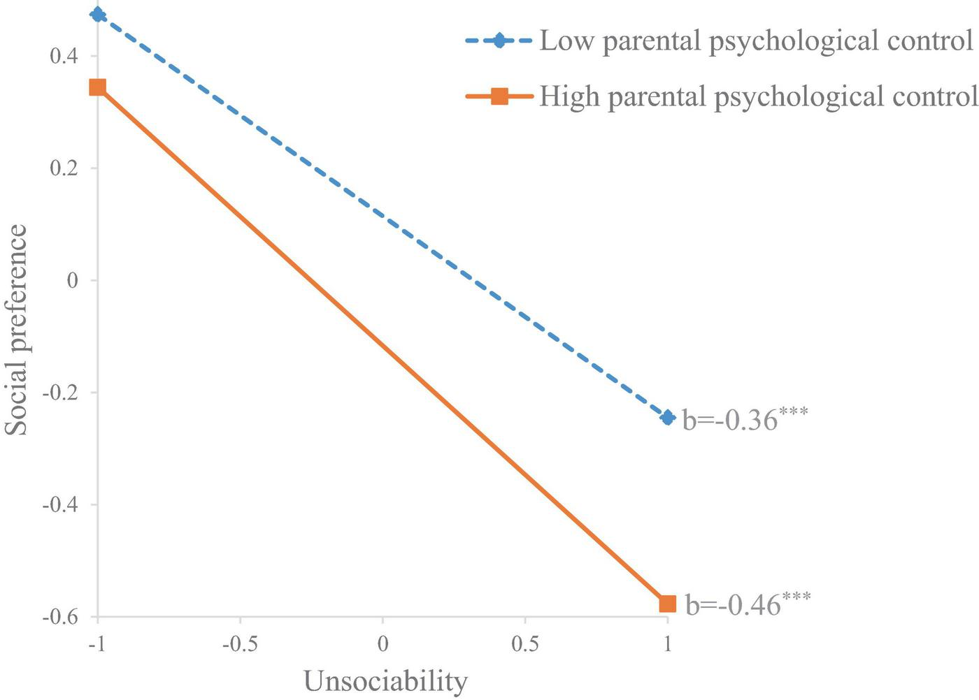 The moderating effect of parental psychological control on the association between unsociability and social preference. ***p < 0.001.
