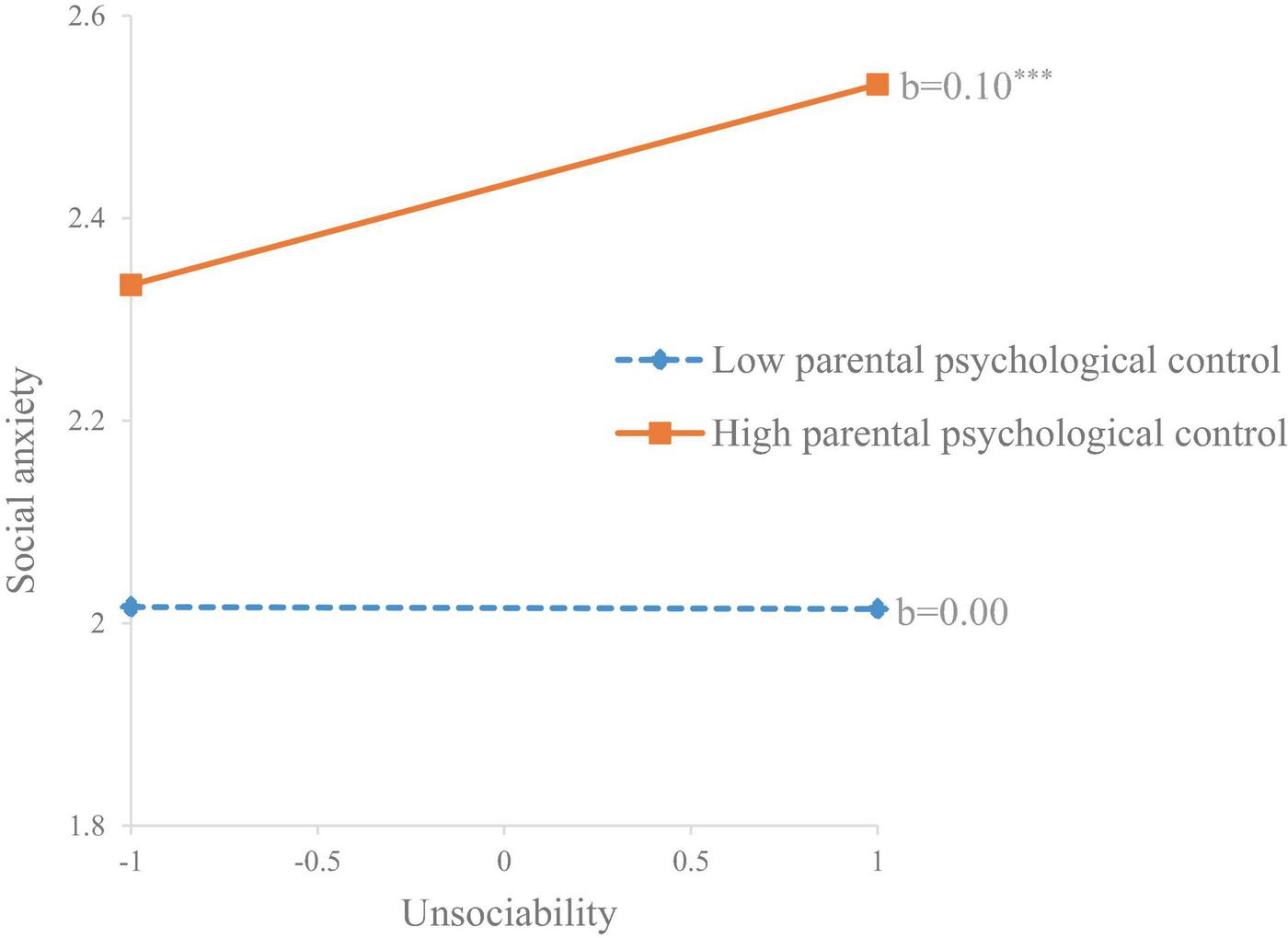 According to the Goodness of Fit Theory (Thomas and Chess, 1977), children would have optimal developmental outcomes when their temperament is a good match for their parents’ parenting style. Given that unsociable children are characterized as preferring for solitary activities (Coplan and Armer, 2007), they may enjoy individual freedom and be reluctant to be restricted by others. As such, it can be speculated that for unsociable children, who have a higher need for autonomy, high parental psychological control is more detrimental for their adjustment than other children. It has been found that children’s unsociability would contribute to more adjustment problems, including peer exclusion, asocial behavior and anxious-fearful behavior when their parents adopted more authoritarian parenting behavior (Zhu et al., 2021). Moreover, it has been found that shy children would suffer from more internalizing problems or peer difficulties when they perceived higher parental psychological control (Bullock et al., 2018). However, as different subtypes of social withdrawal, children of unsociability have different social motivational tendencies compared to their peers of shyness. Therefore, it is essential to explore the role of parental psychological control in their adjustment and development.